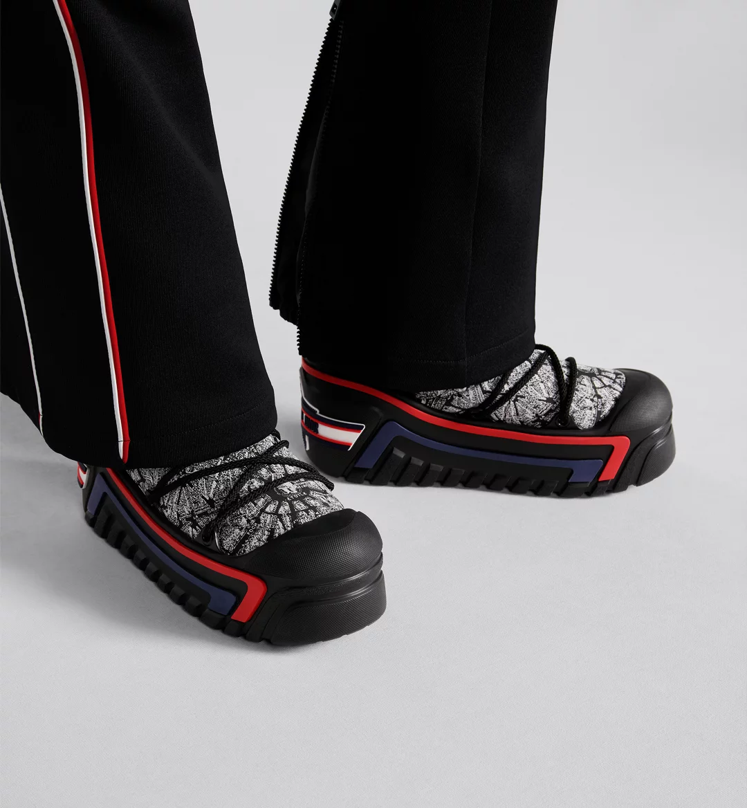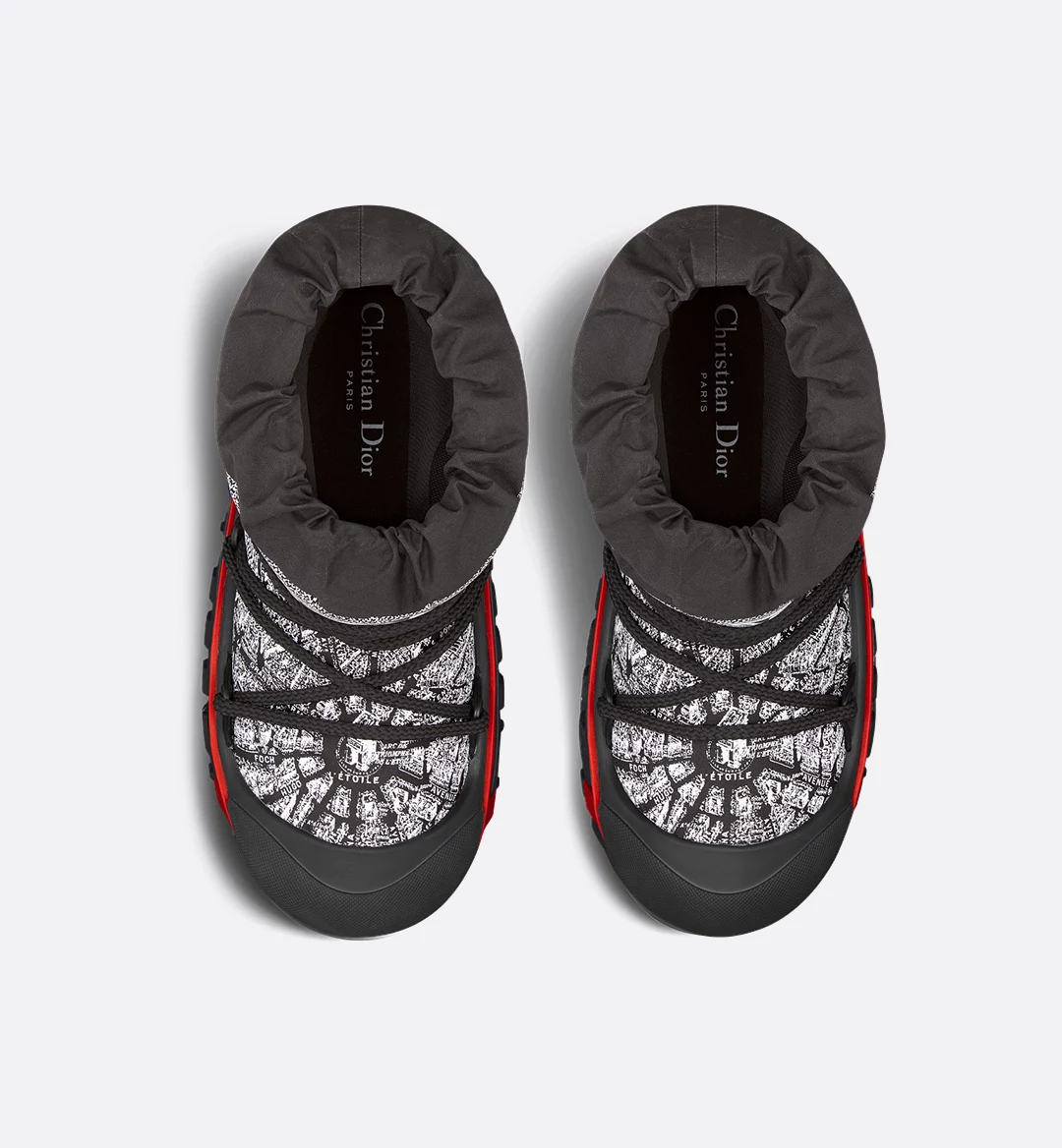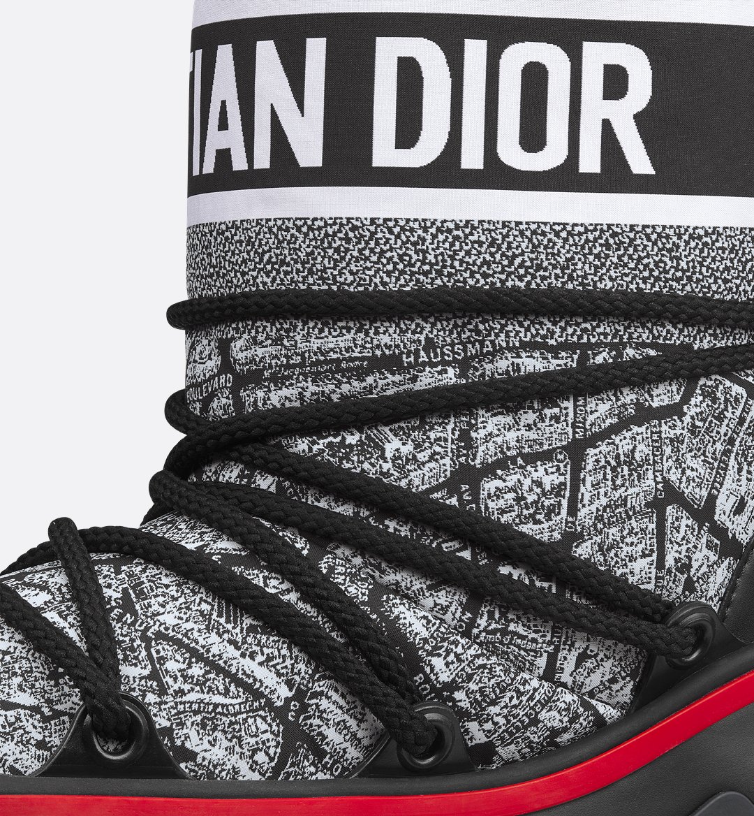 The apr??s-ski boot, created for the DiorAlps capsule, is distinguished by its design. The black and white Plan de Paris shiny nylon upper is inspired by House archives and structured around Avenue Montaigne. Completed by cross lacing for an optimal fit, it showcases the Christian Dior signature on the upper as well as the supple, lightweight black three-tone sole, further embellished with a hallmark star. The technical ankle boot, with its low silhouette, may be worn in either the city or the mountains, and may be coordinated with other DiorAlps creations.