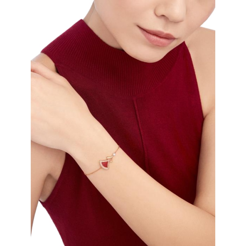 The Divas’ Dream bracelet in 18K rose gold is a subtle expression of joyful femininity, with a vibrant and colorful design that interprets the iconic fan pattern. The signature aesthetic of the collection is presented in a sophisticated design, with a carnelian and pave diamonds, reflecting Bvlgari’s Roman heritage. This elegant and timeless piece celebrates the beauty of nature.
