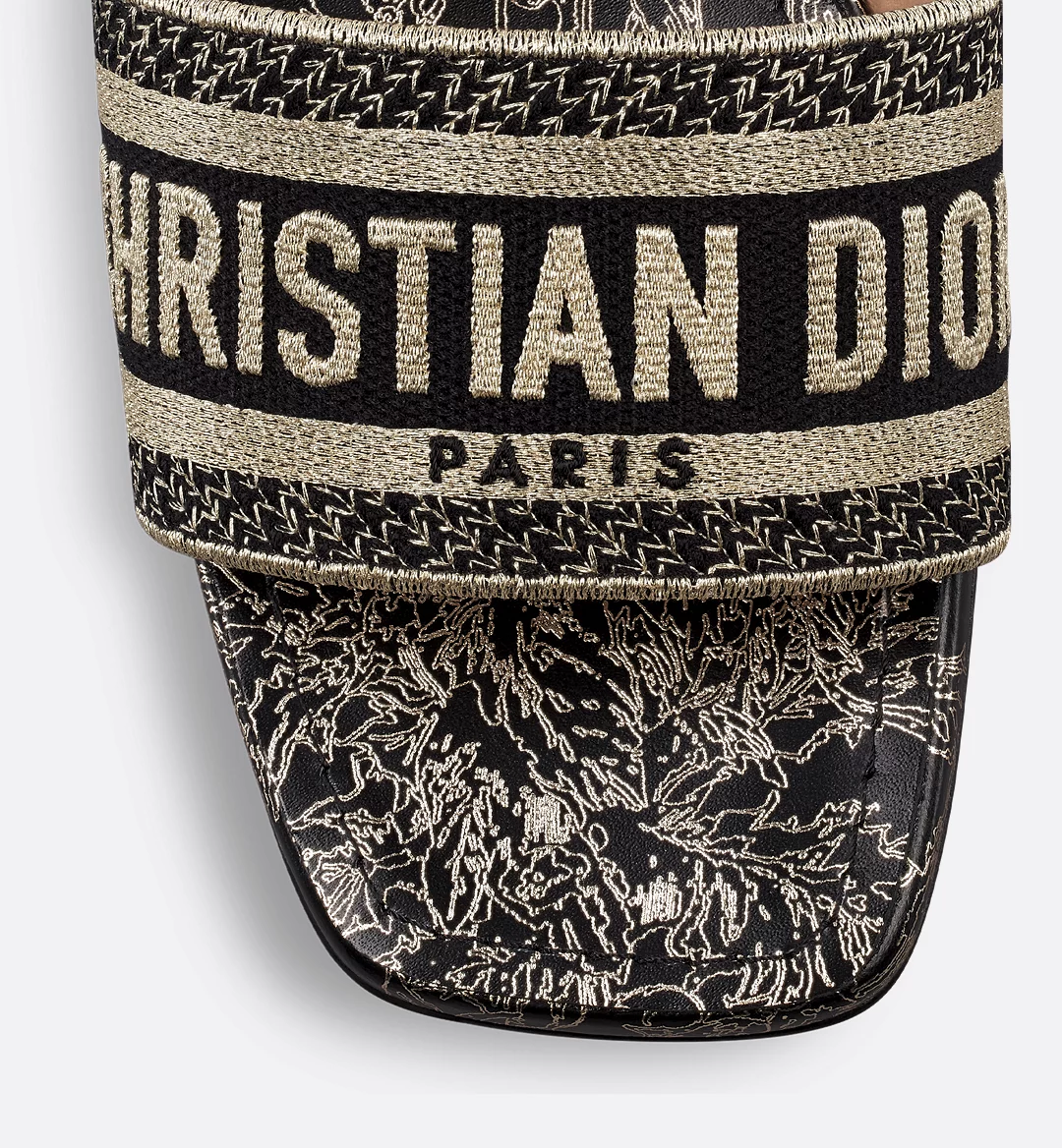 The hallmark Dway heeled slide features the black and gold-tone Dior Chardons motif by Pietro Ruffo, showcasing Scotland’s emblematic flower, symbolizing protection, resilience and liberty. The upper, punctuated with gold-tone metallic thread, is embroidered with the Christian Dior Paris signature for an instantly recognizable touch, while the square toe accentuates its contemporary appeal. Completed by a 3.5-cm (1.5-inch) cylindrical heel, the slide will add a modern touch to any outfit and will pair with other Dior Chardons creations from the collection.