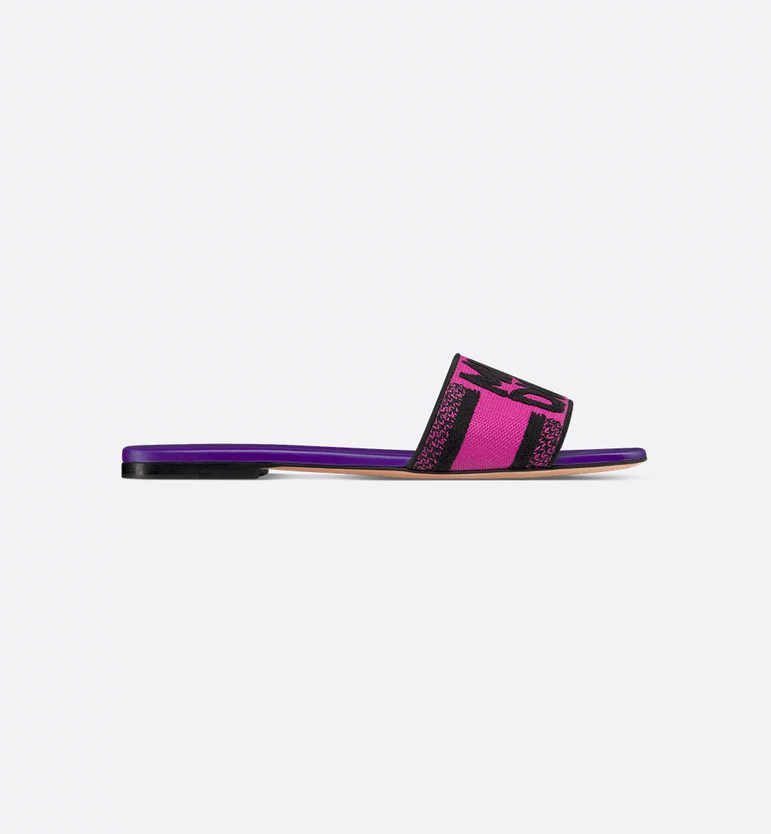 The Dway slide features the black Miss Dior Graffiti motif, a nod to the 1967 debut ready-to-wear collection and a manifesto to Maria Grazia Chiuri’s signature celebration of feminism. The fuchsia and black embroidered cotton upper is contrasted with the purple leather insole. The sleek design slips on easily for a laid-back style. The shoe can be paired with other Miss Dior Graffiti creations.