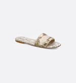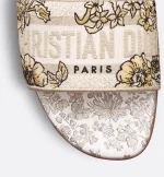 The Dway slide is an emblematic and timeless design featuring the gold-tone Millefiori Unicorn motif by Pietro Ruffo showcasing a unicorn, symbolic in Scottish mythology, in a romantic floral setting. The upper is embroidered with the Christian Dior Paris signature, lending an instantly recognizable touch. Its streamlined silhouette makes it easy to slip on to complete a relaxed look. The shoe can be styled with other Millefiori Unicorn creations from the collection.