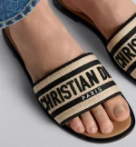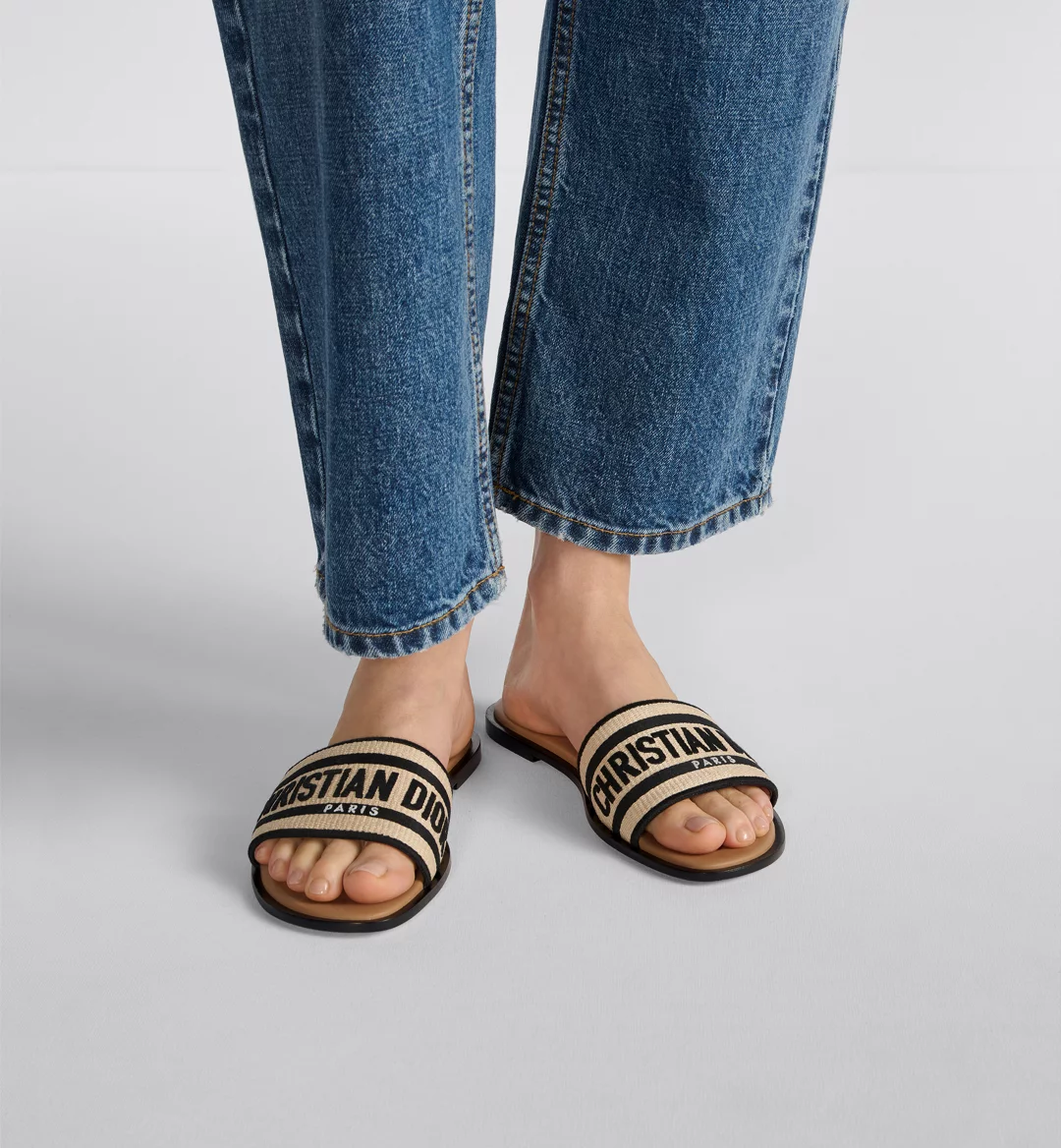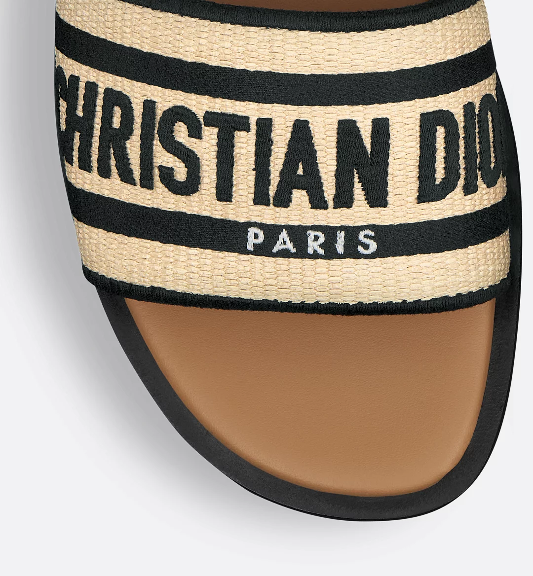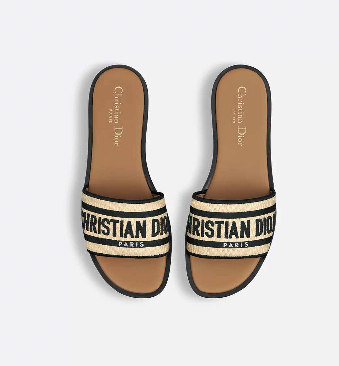 The Dway slide is a timeless and emblematic silhouette. The upper in natural raffia and black cotton is embroidered with the instantly recognizable Christian Dior Paris signature. The padded leather insole offers ultimate comfort while the streamlined design makes it easy to slip on for a laid-back look.