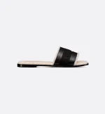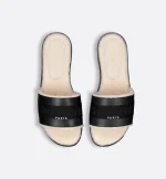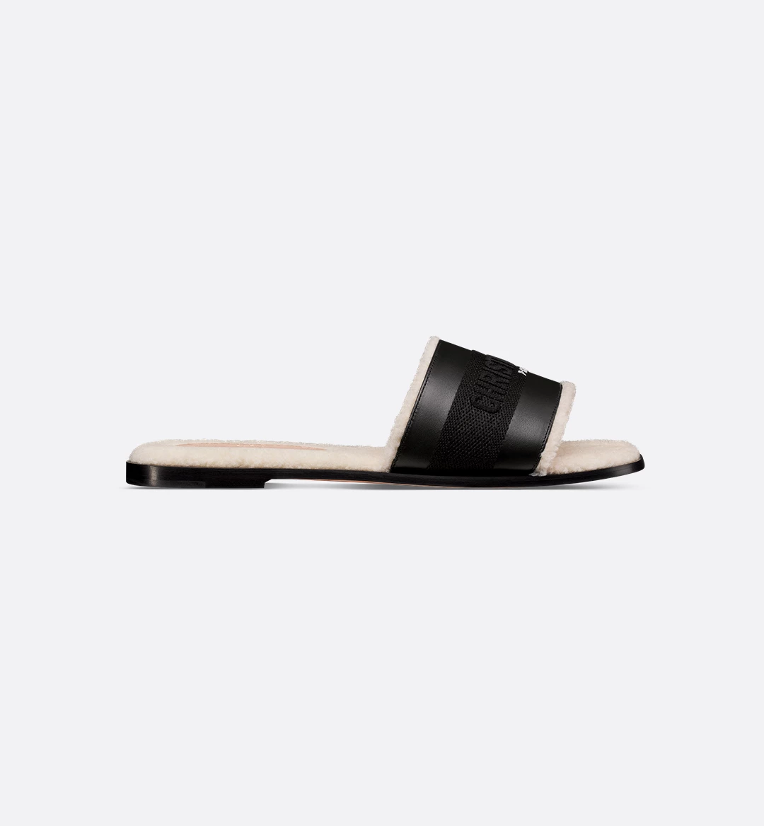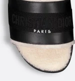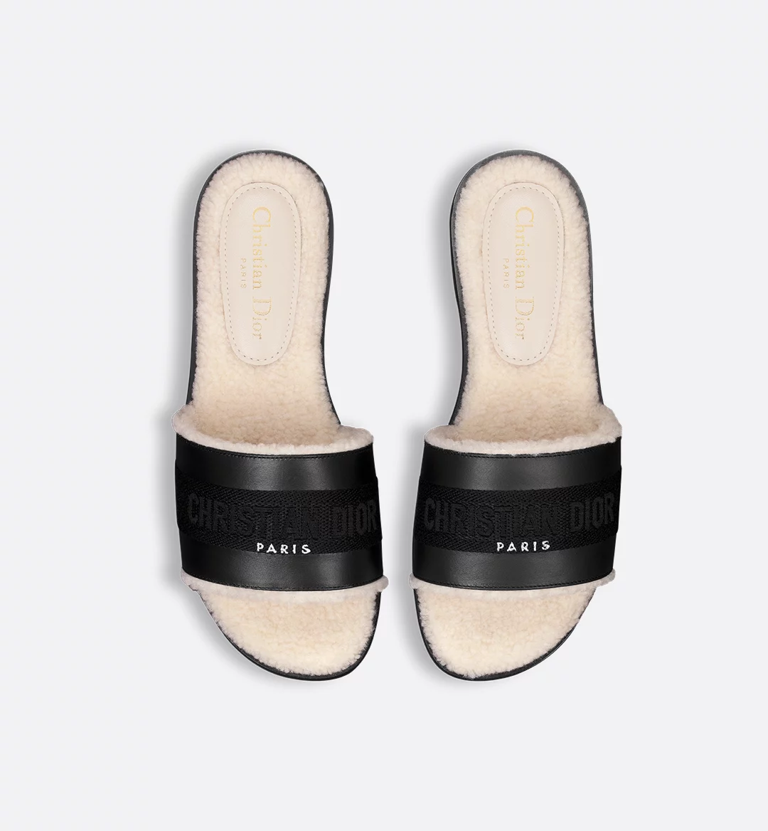 The Dway slide revisits a timeless and emblematic silhouette. The upper in black calfskin and cotton embroidered with the Christian Dior Paris signature instantly stands out. The white sheepskin-effect lining and insole offer ultimate comfort. Its streamlined design allows it to be easily slipped on to complete a laid-back outfit.