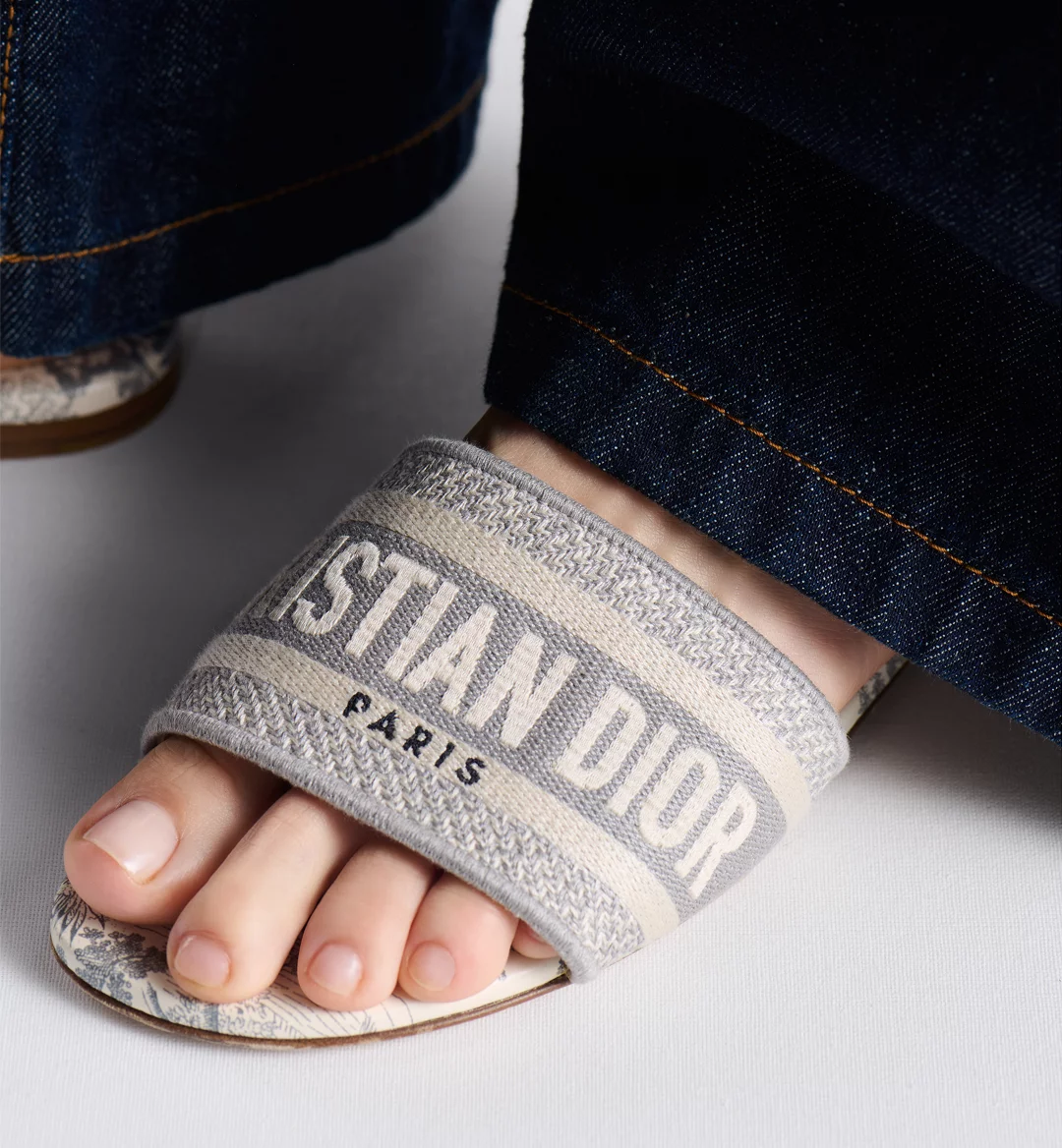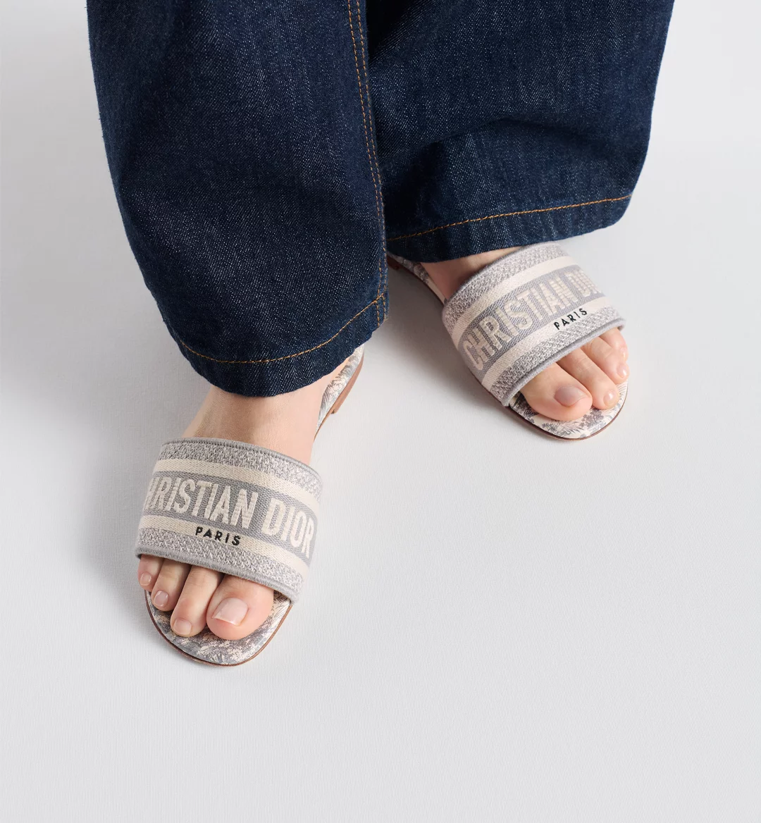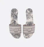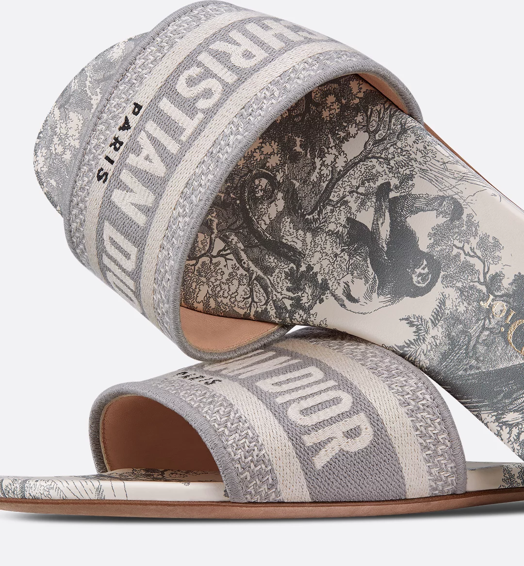 The Dway slide is a hallmark and timeless style honoring the House’s Toile de Jouy motif. The gray upper has an embroidered Christian Dior Paris signature for an instantly recognizable touch. Its streamlined silhouette makes it easy to slip on to complete a relaxed look. The shoe will pair well with other Toile de Jouy creations from the collection.