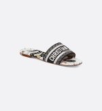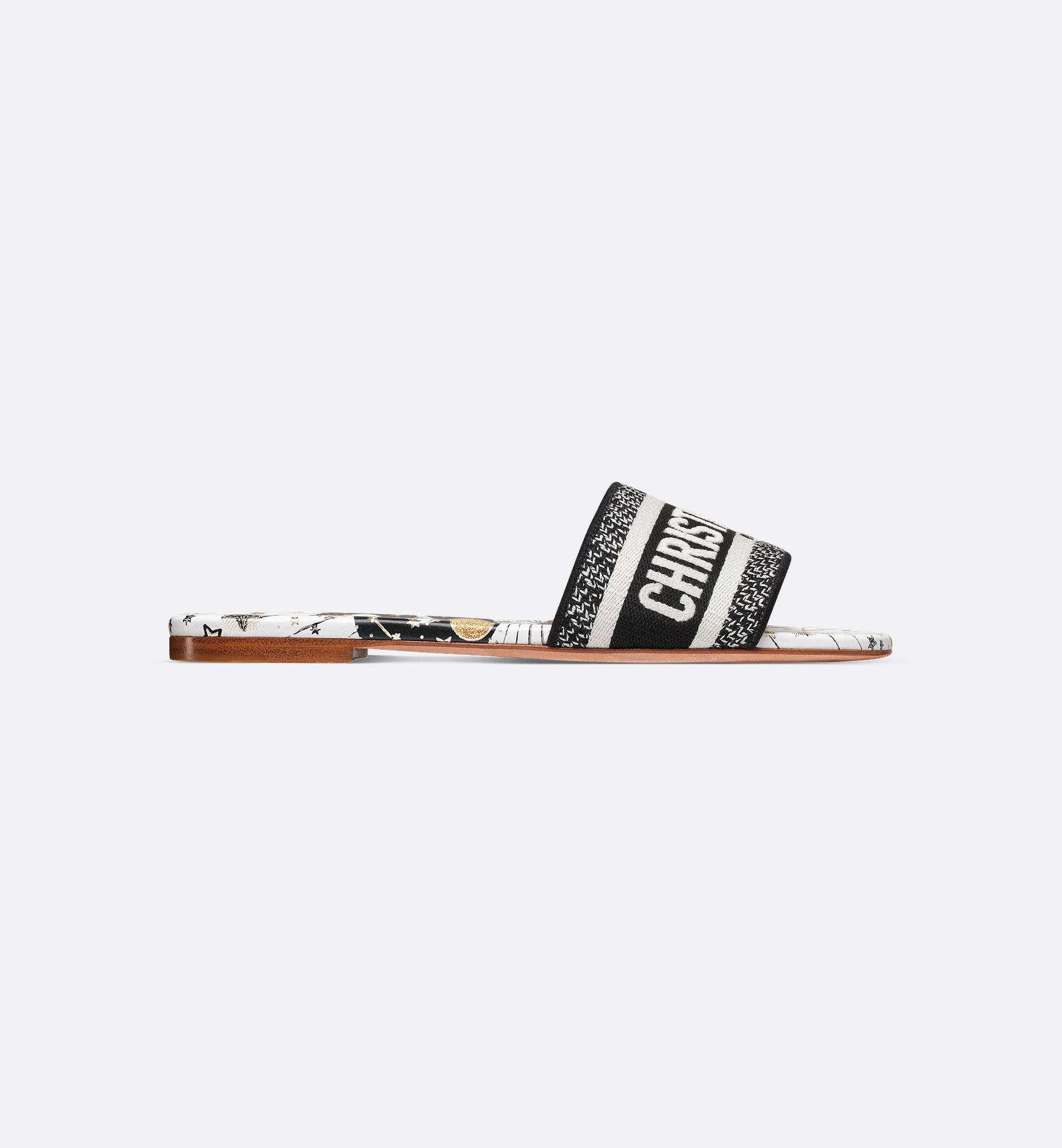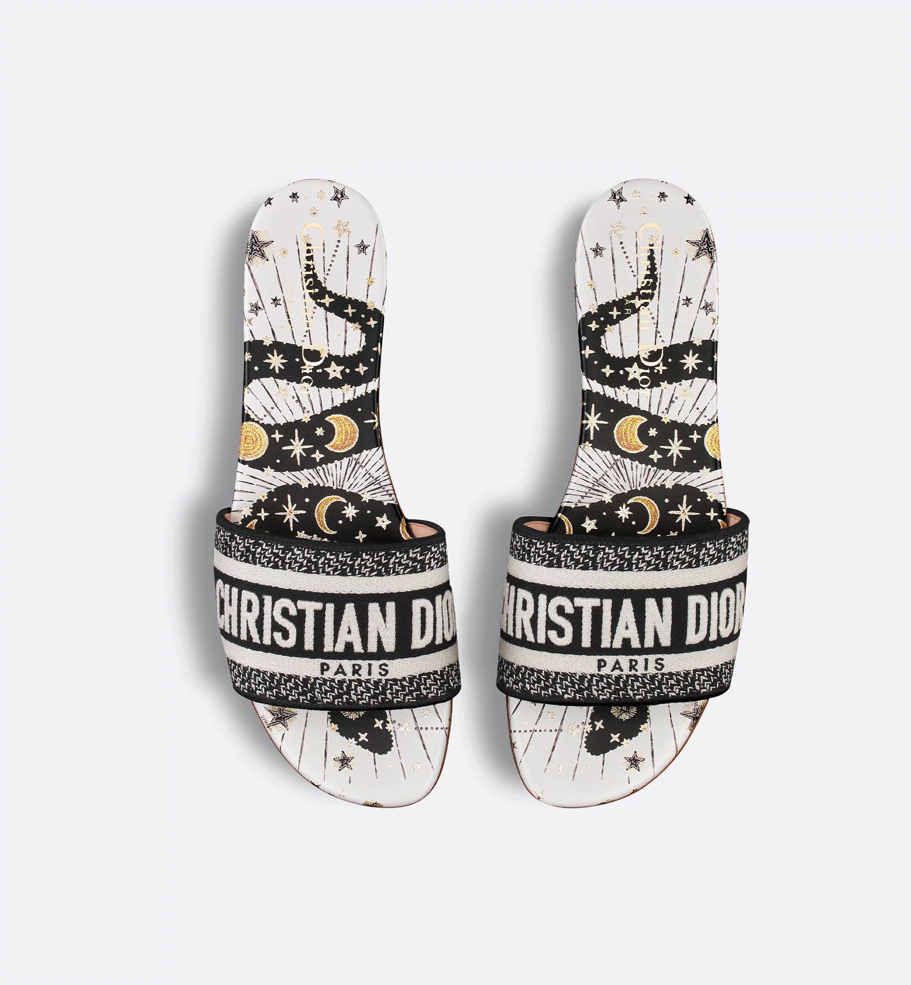 The hallmark and timeless Dway slide features the black, white and gold-tone Dior Astral motif, showcasing a snake embellished with the Serpens constellation and the phases of the moon, in an ode to Mr. Dior’s passion for astrology. The upper embroidered with the Christian Dior Paris signature adds an instantly recognizable touch. The streamlined shoe slips on easily and offers effortless style. The shoe can be paired with other Dior Astral creations.