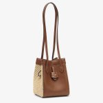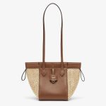 Mini Origami bag made of smooth brown leather with crochet straw panels. The style recalls the duality and creativity of Fendi with an innovative and transformable design:the ingenious closure with eight magnets means the bag can be folded, origami-style, transforming it from a bucket bag, when the magnets come together in the middle with a magic clasp, into a shopper by gently pulling the leather ties on the short shoulder straps on each side.