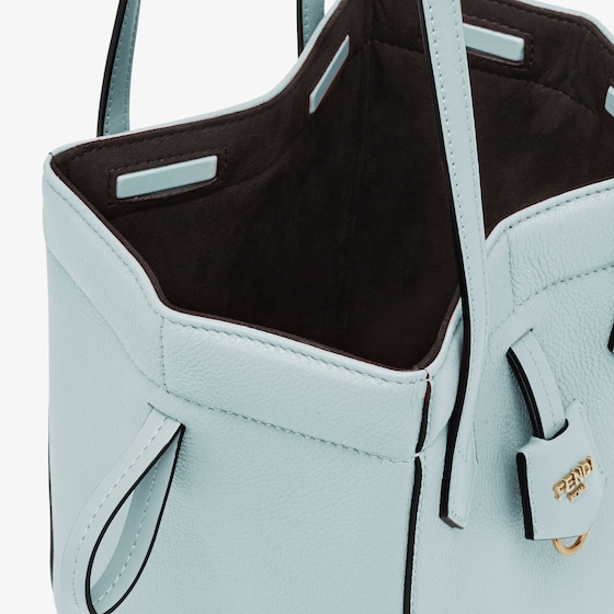 Mini Origami bag made of light blue full-grain leather. The style recalls the dual nature and creativity of Fendi with an innovative design that can be transformed:the ingenious closure with eight magnets means the bag can be folded, origami-style, transforming it from a bucket bag – when the magnets come together in the middle with a magic clasp – into a shopper by gently pulling the short shoulder straps on each side.