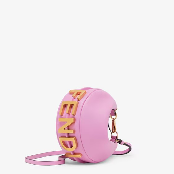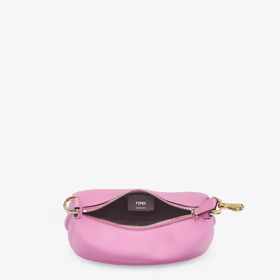 Mini hobo bag, part of the collection curated with designer Stefano Pilati, made of soft pink leather, embellished with vintage gold metal FENDI lettering.