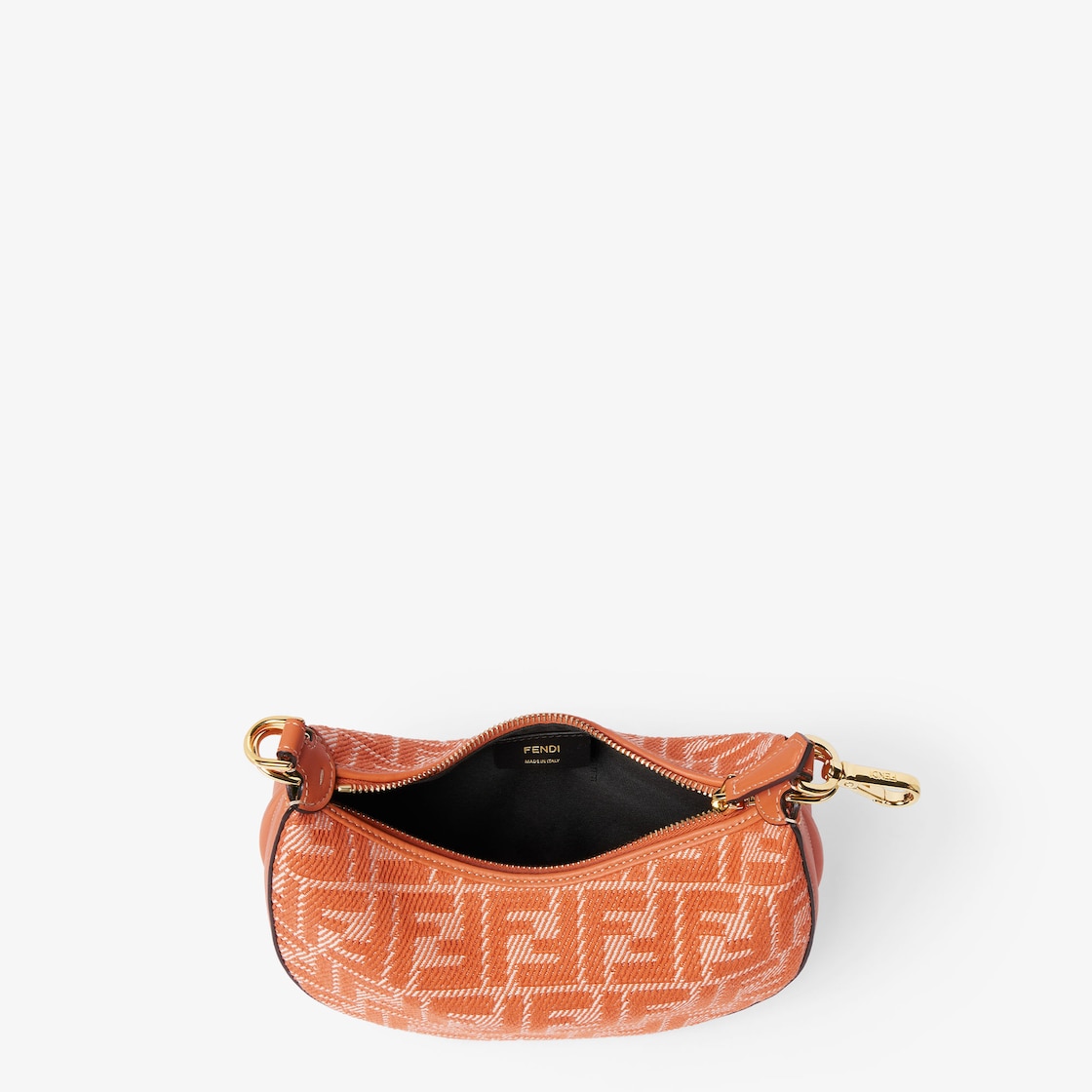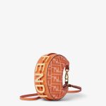 Made of denim-effect FF jacquard in shades of orange, decorated with vintage gold metal FENDI lettering on the base, visible when the bag is worn.