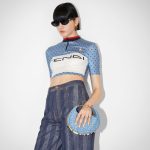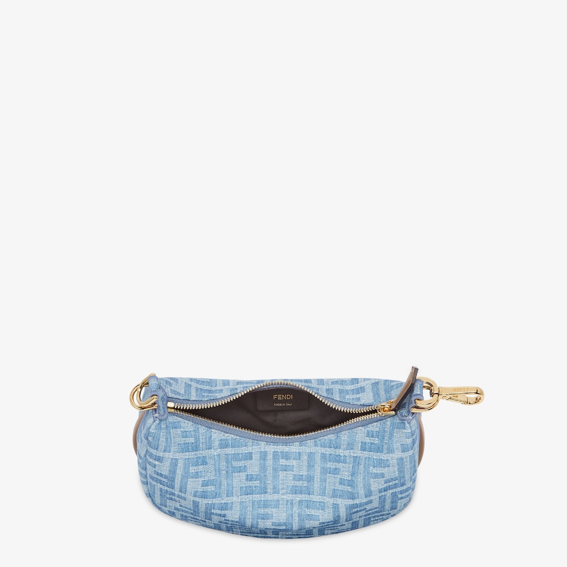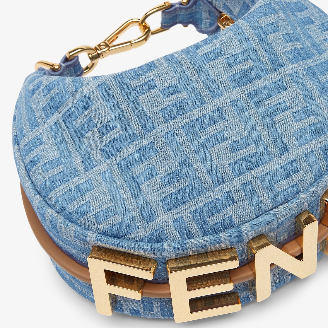 Mini Hobo bag made of denim-effect, light blue fabric with an FF motif. Embellished with vintage-gold metal Fendi lettering.