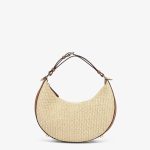 Small hobo bag made of natural-colored straw in a moss-stitch textured weave, with background and details in brown leather. With vintage gold metal FENDI lettering visible when the bag is worn under the arm.