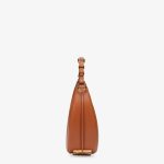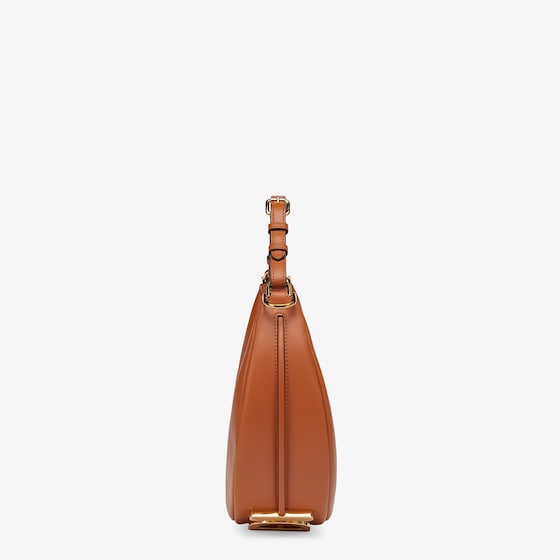 Small hobo bag made of supple brown leather, decorated with vintage gold metal FENDI lettering visible when wearing the bag under the arm.