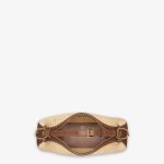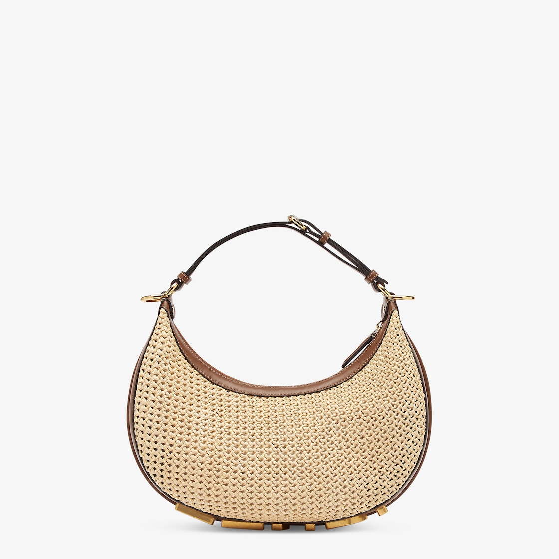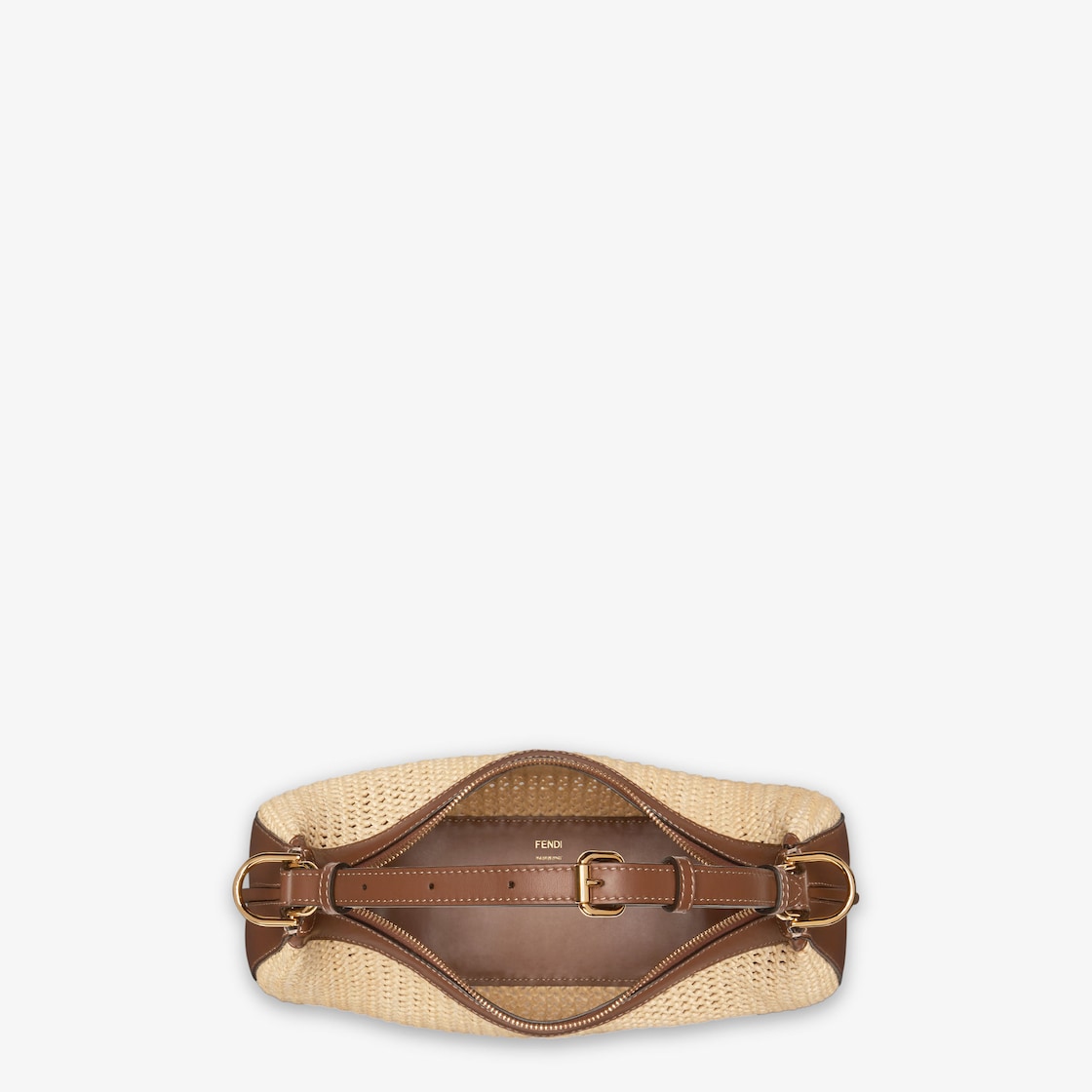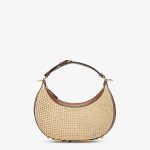 Made of natural-coloured macramé, trimmed with brown calfskin, embellished with vintage gold metal FENDI lettering at the bottom, visible when wearing the bag under the arm.