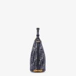 Made of chenille with the iconic FF motif in gradient dark blue tones, decorated with vintage gold-finish metal FENDI lettering on the base, visible when wearing the bag under the arm.
