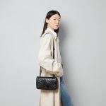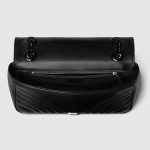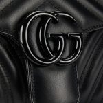 The small GG Marmont chain shoulder bag has a softly structured shape and an oversized flap closure with Double G hardware. The sliding chain strap can be worn multiple ways, changing between a shoulder and a top handle bag. Made in matelasse chevron leather, the accessory is introduced for Gucci Love Parade with monochrome hardware.