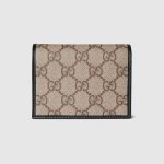 The House presents the new GG monogram coated fabric, a soft and lightweight material with durability over time. This beige and dark brown Gucci Horsebit 1955 card case wallet comes with refined leather trim in black.