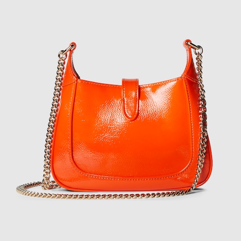 The Jackie Notte is a new handbag designed for Gucci by Creative Director Sabato De Sarno. It embodies the self-confidence of the iconic Jackie line, with a new silhouette and subtle details that make it perfect for nighttime wear. Orange patent leather, a hook closure, and light gold-toned Gucci lettering chain strap give this mini shoulder bag a unique touch.