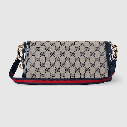 Gucci Luce, which translates to light in Italian, radiates playful charm and boundless joy. The Original GG canvas lends itself to this small shoulder bag design. The beige and dark blue motif is accentuated by dark blue leather trim and light gold-toned hardware. The blue and red stripe Web is detachable through a leather loop and hardware ring on the sides, giving the bag additional function and structure.