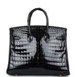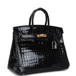 This Birkin is inBlack shinyNiloticuscrocodile leather with gold hardware and has tonal stitching, front strap, two straps with center toggle closure, clochette with lock and two keys and double rolled handles.