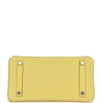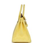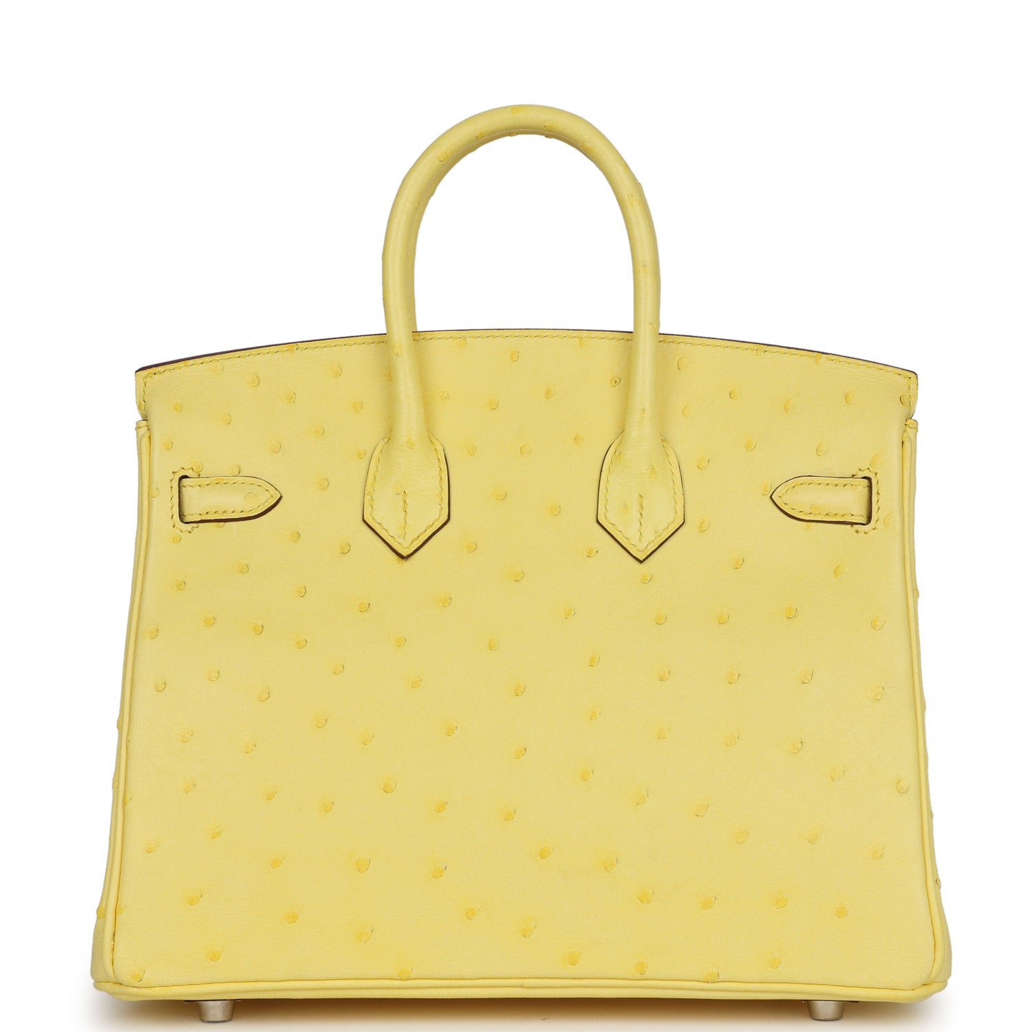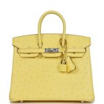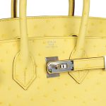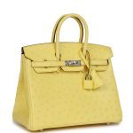 This Birkin 25 is inJaune Citronostrichleather with palladium hardware and has tonal stitching, front strap, two straps with center toggle closure, clochette with lock and two keys and double rolled handles.