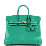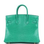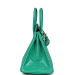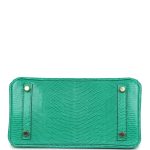 This Birkin is in Menthe Varanus Niloticus Lizard leather with gold hardware and has tonal stitching, front strap, two straps with center toggle closure, clochette with lock and two keys and double rolled handles.