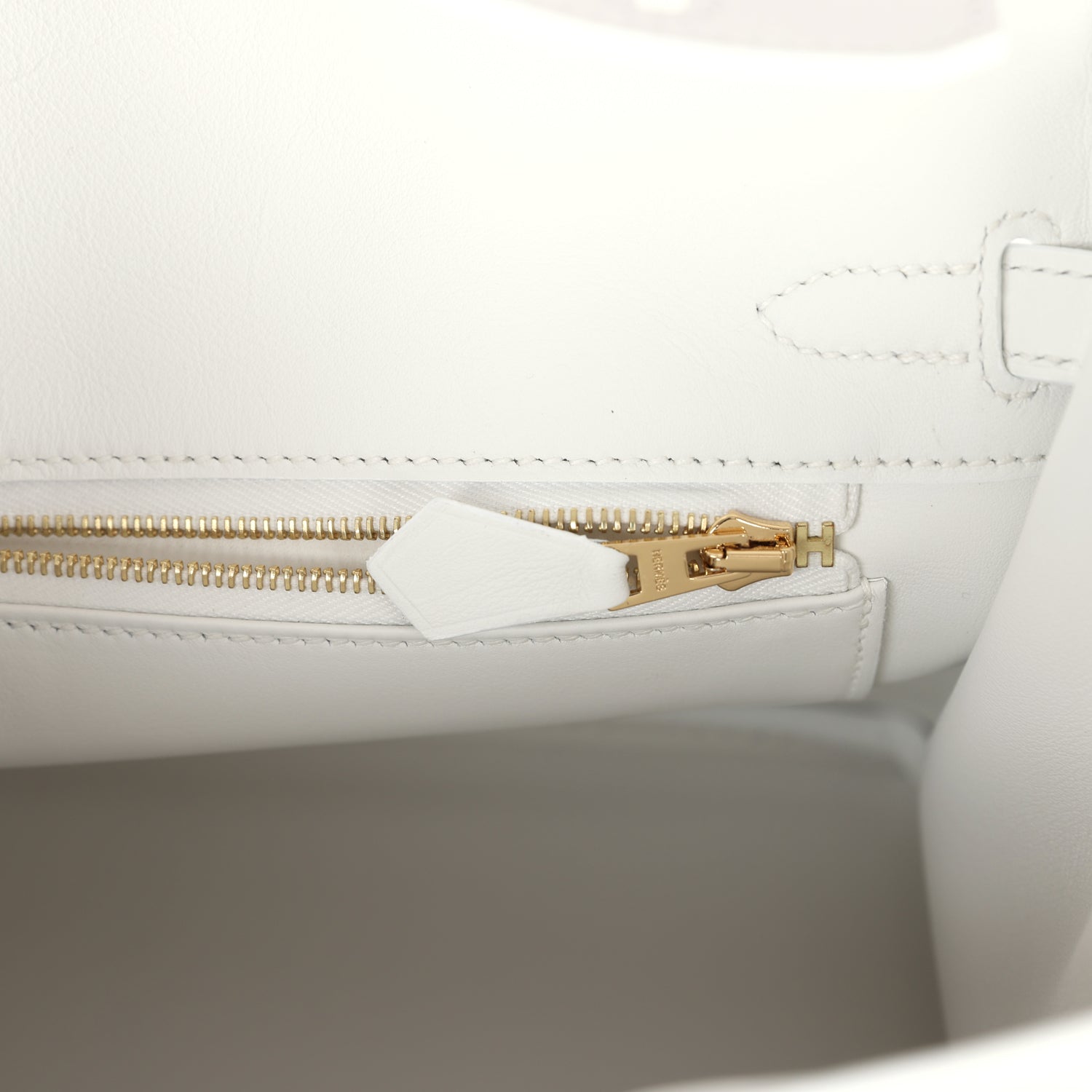 The interior is lined with New White Swift leather and has one zip pocket with an Hermès engraved zipper pull and an open pocket on the opposite side.