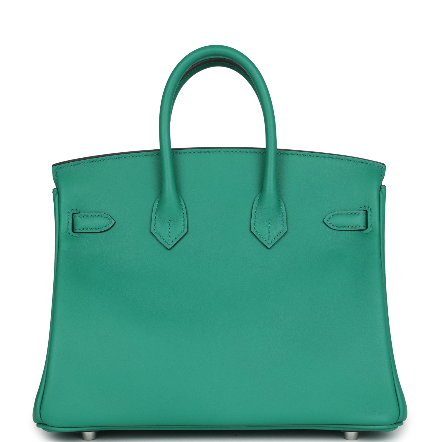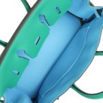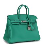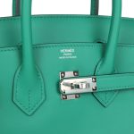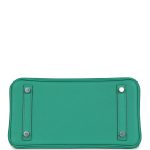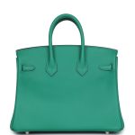 This Birkin is in Vert Vertigo and Bleu Celeste swift leather with palladium hardware and has tonal stitching, front flap, two straps with center toggle closure, clochette with lock and two keys, and double rolled handles.