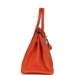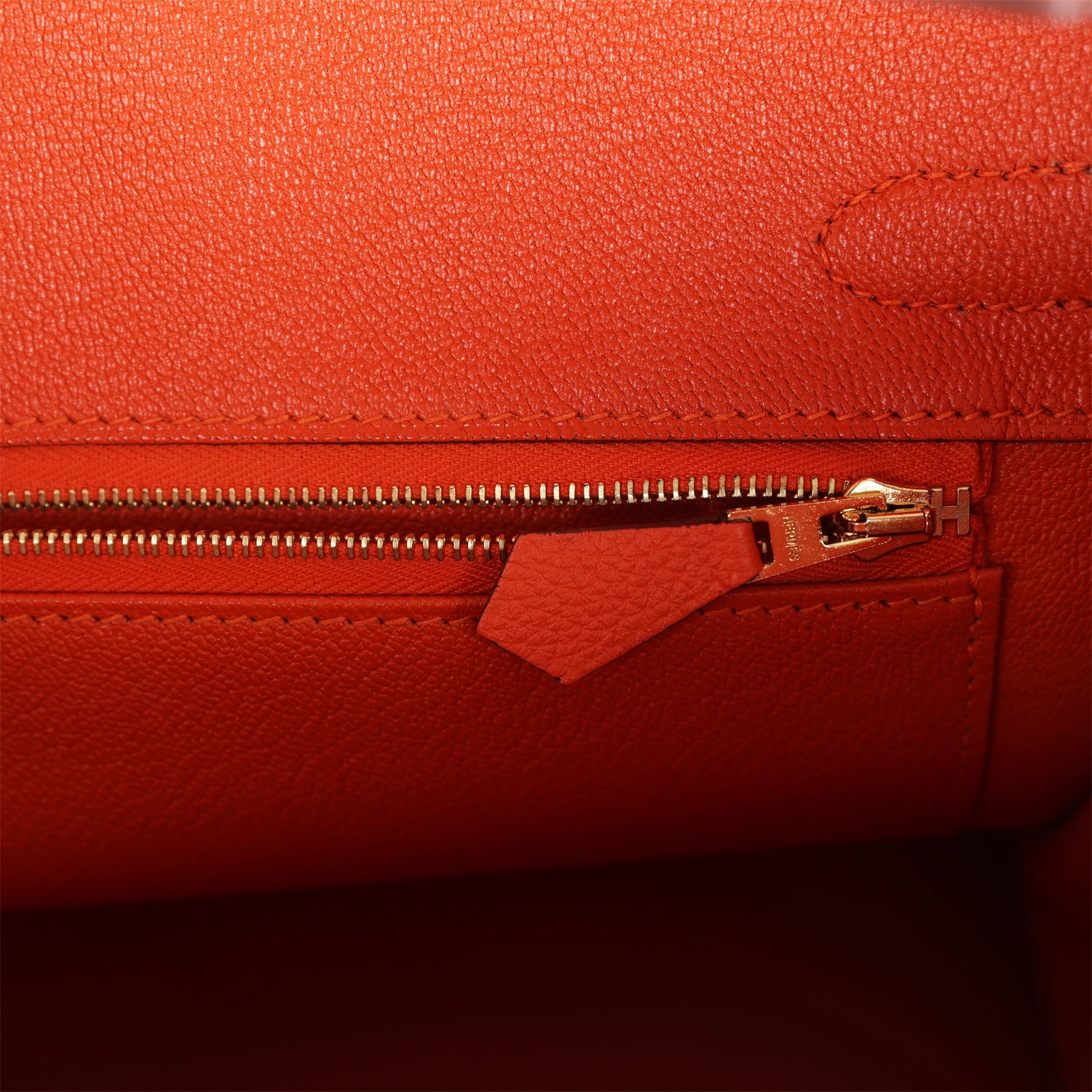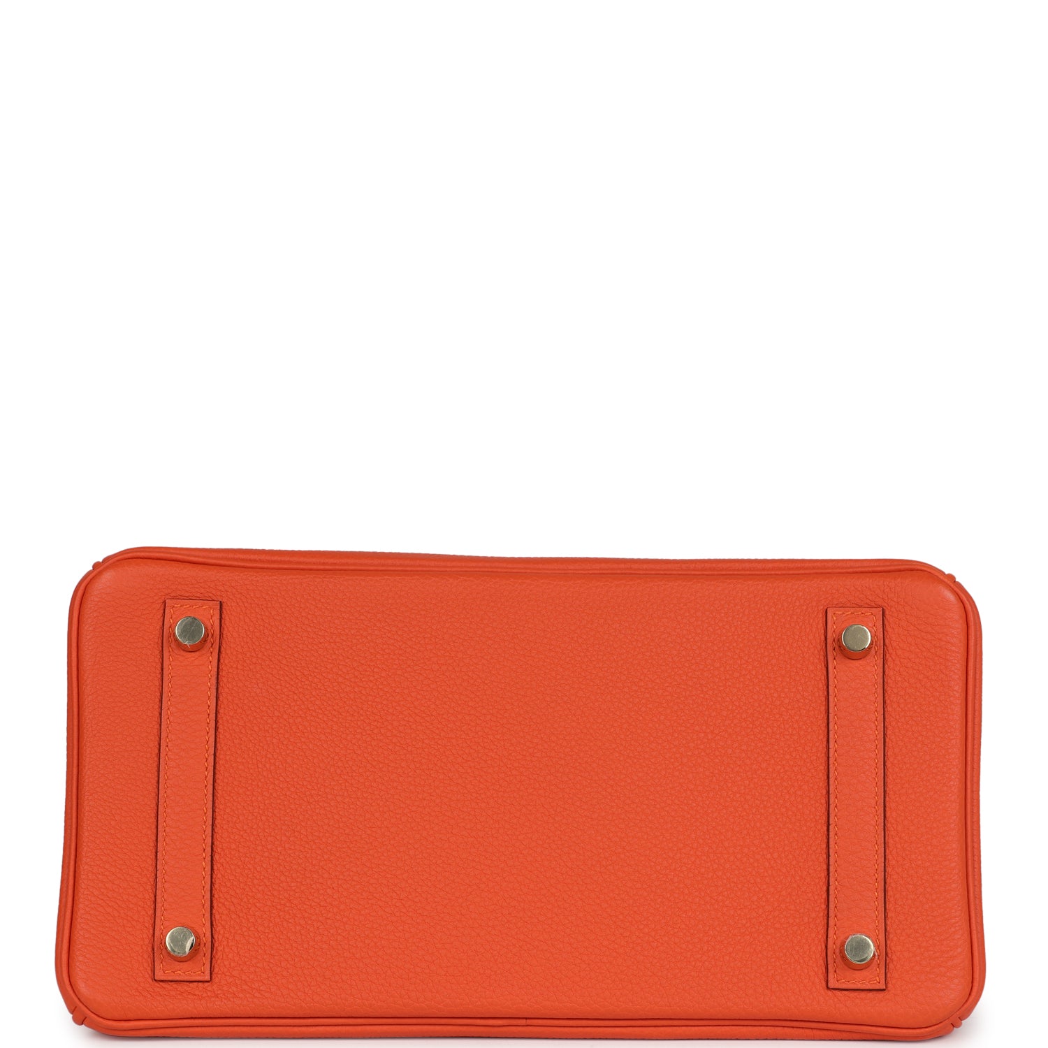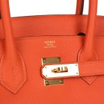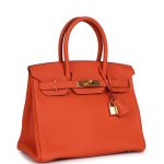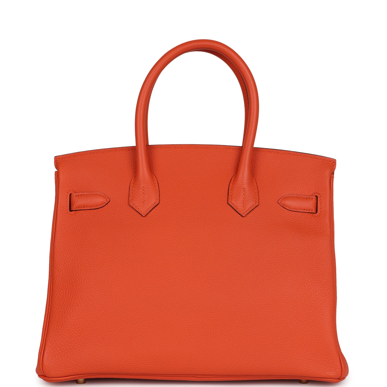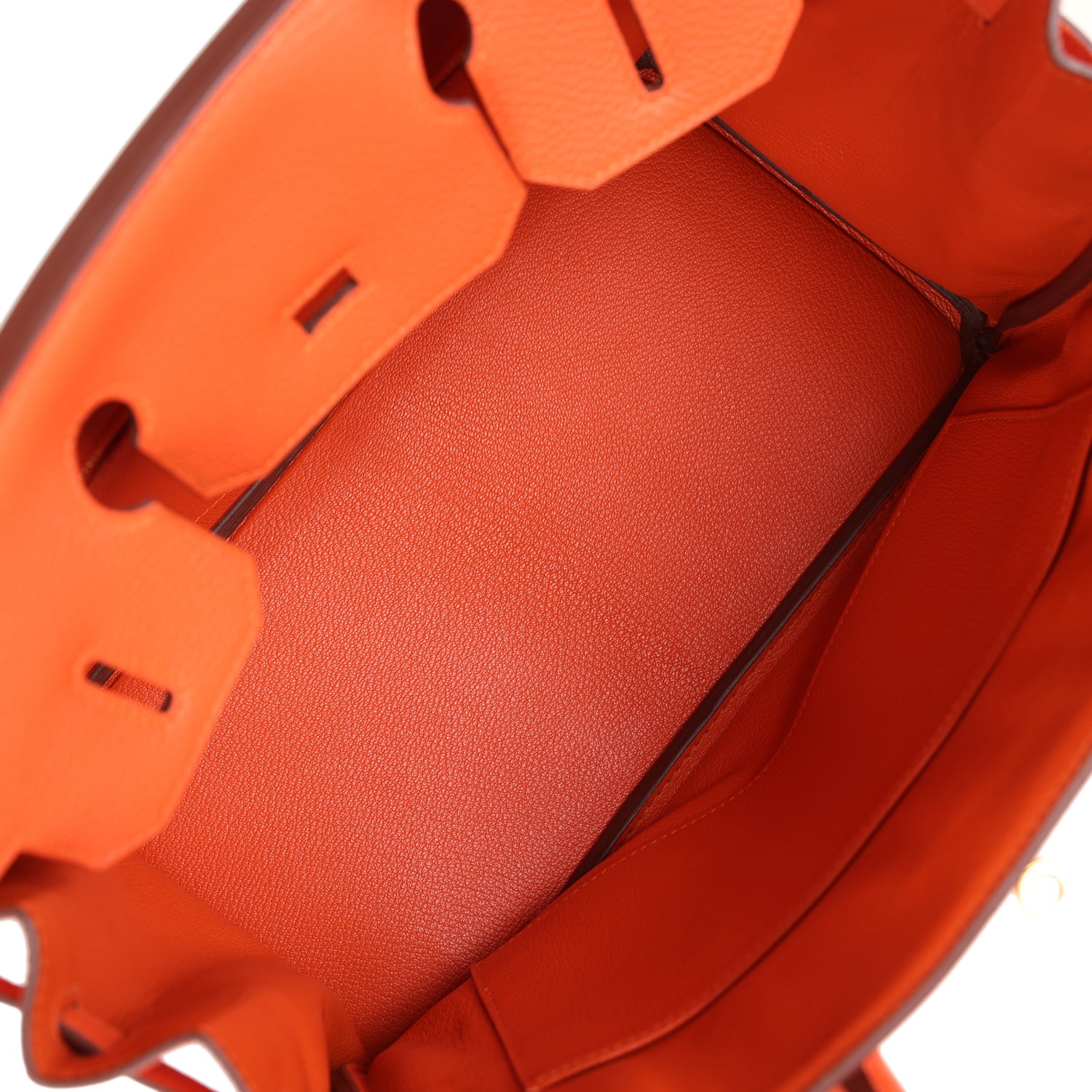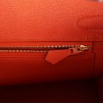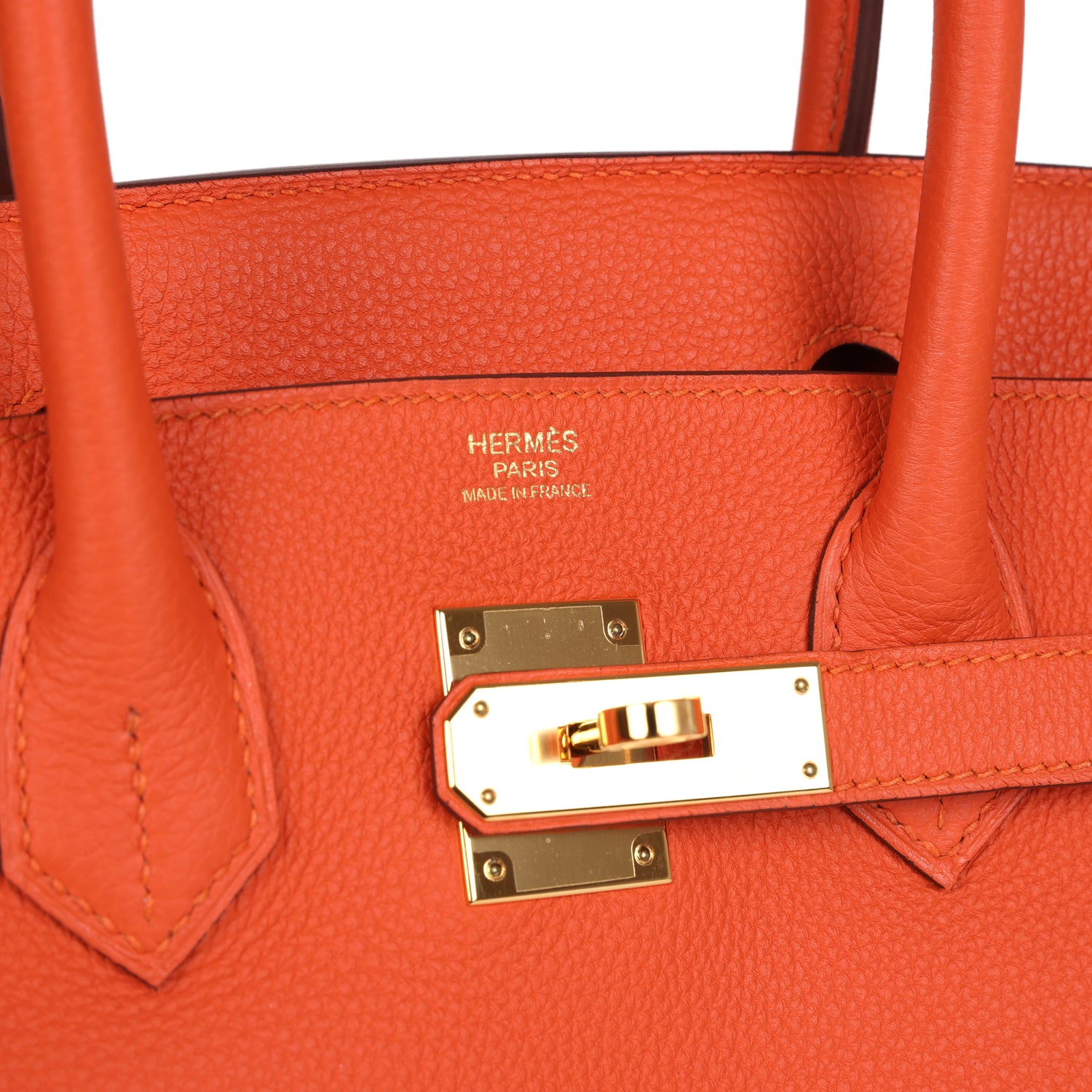 This Birkin is in Feu togo leather with gold hardware and has tonal stitching, front flap, two straps with center toggle closure, clochette with lock and two keys and double rolled handles.