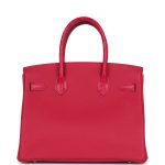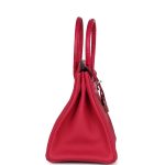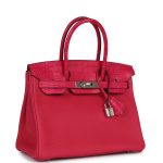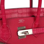 ThisBirkin “Touch” is in Framboise togo leather and Matte Alligator leather with palladium hardware and has tonal stitching, two straps with front toggle closure, clochette with lock and two keys and double rolled crocodile handles.