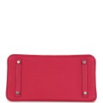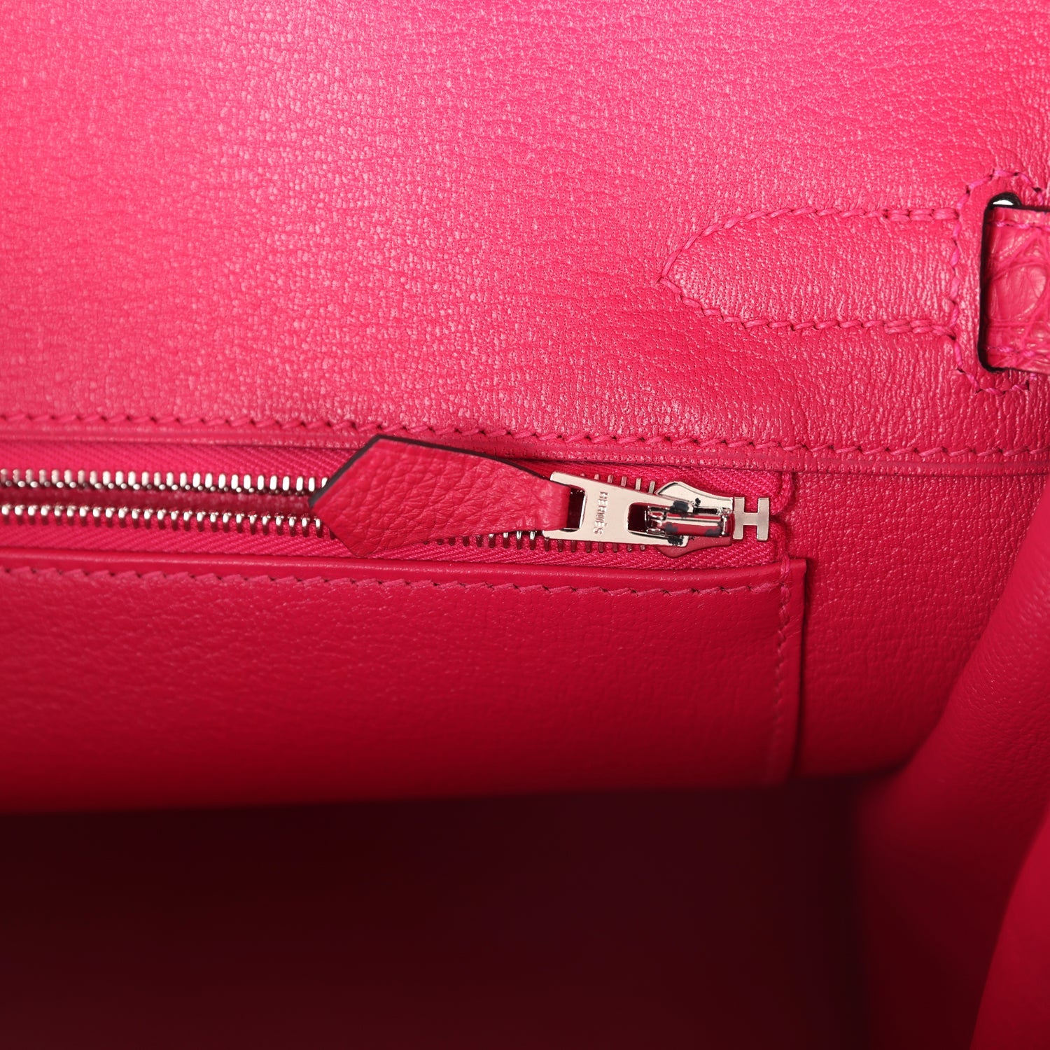 The interior is lined with Framboise chevre and has a zip pocket with an Hermès engraved zipper pull and an open pocket on the opposite side.