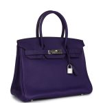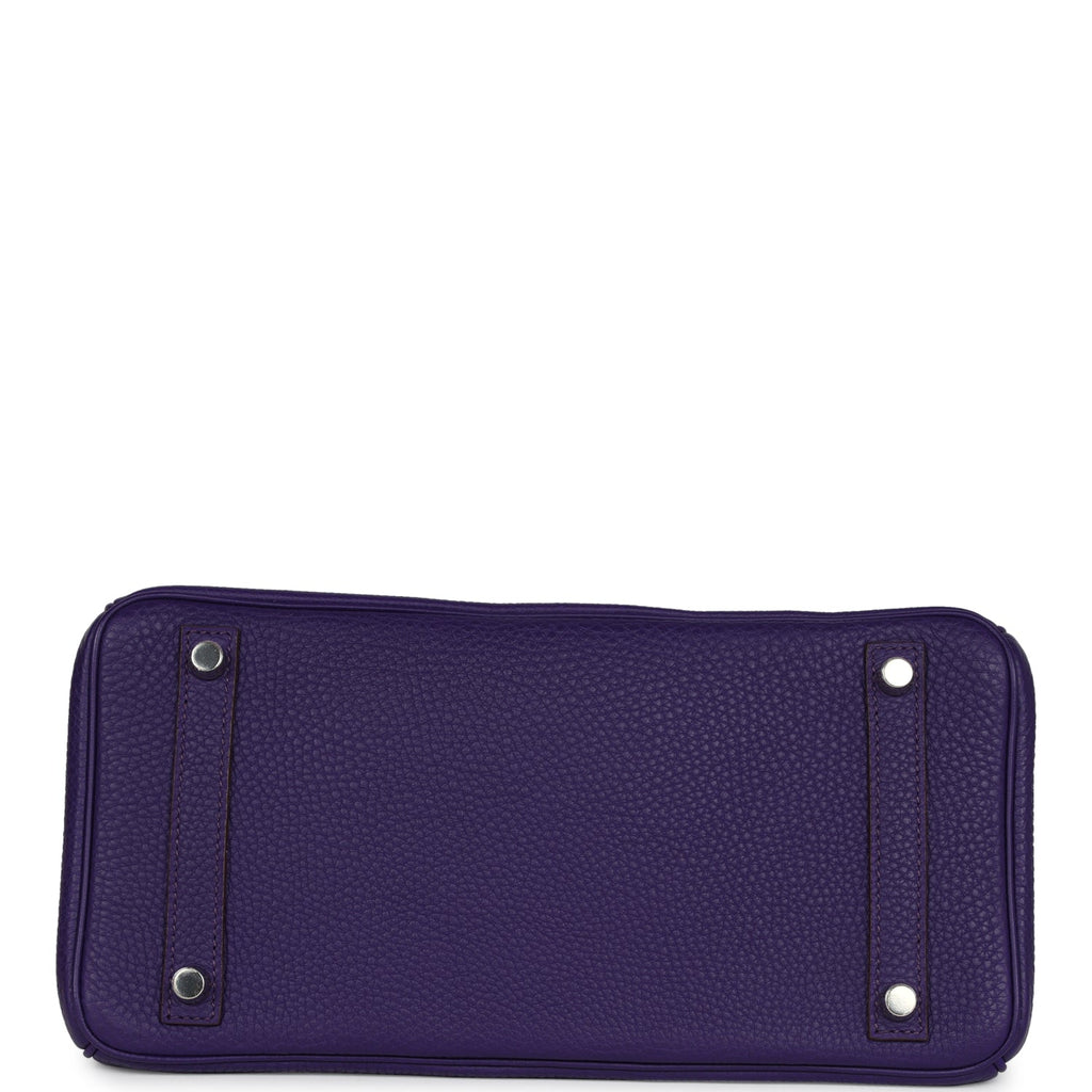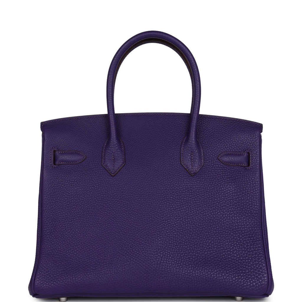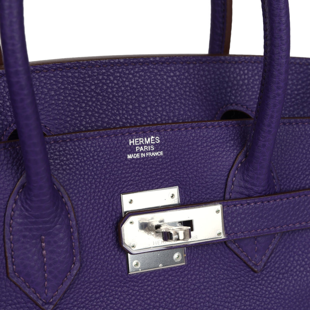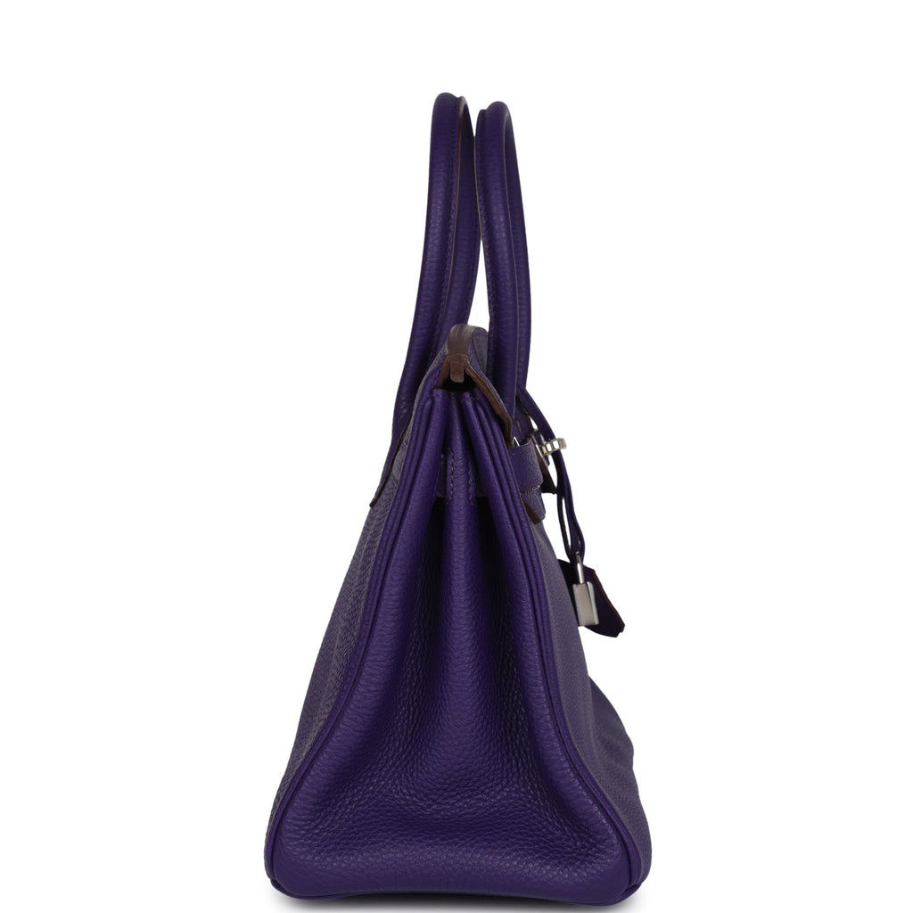 This Birkin is inIris clemence leather with gold hardware, and has tonal stitching, front flap with two straps, front toggle closure, clochette with lock and two keys, and double rolled handles.