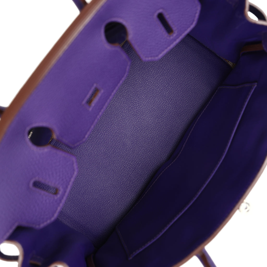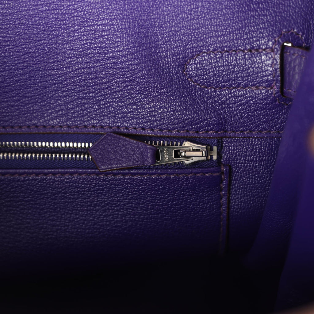 The interior is lined in Iris chevre leather and has one zip pocket with Hermès engraved pull; pocket on opposite side.