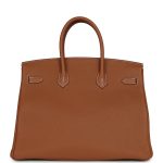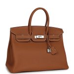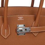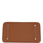 This Birkin is in Gold togo leather withpalladium hardware and has contrast stitching, two straps with front toggle closure, clochette with lock and two keys and double rolled handles.
