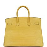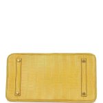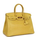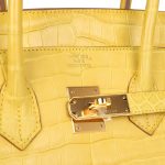 This Birkin is of Mimosa Matte Crocodile Porosus leather with gold hardware and features tonal stitching,front flap, two straps withcentertoggle closure, clochette with lock and two keys, and double rolled handles.
