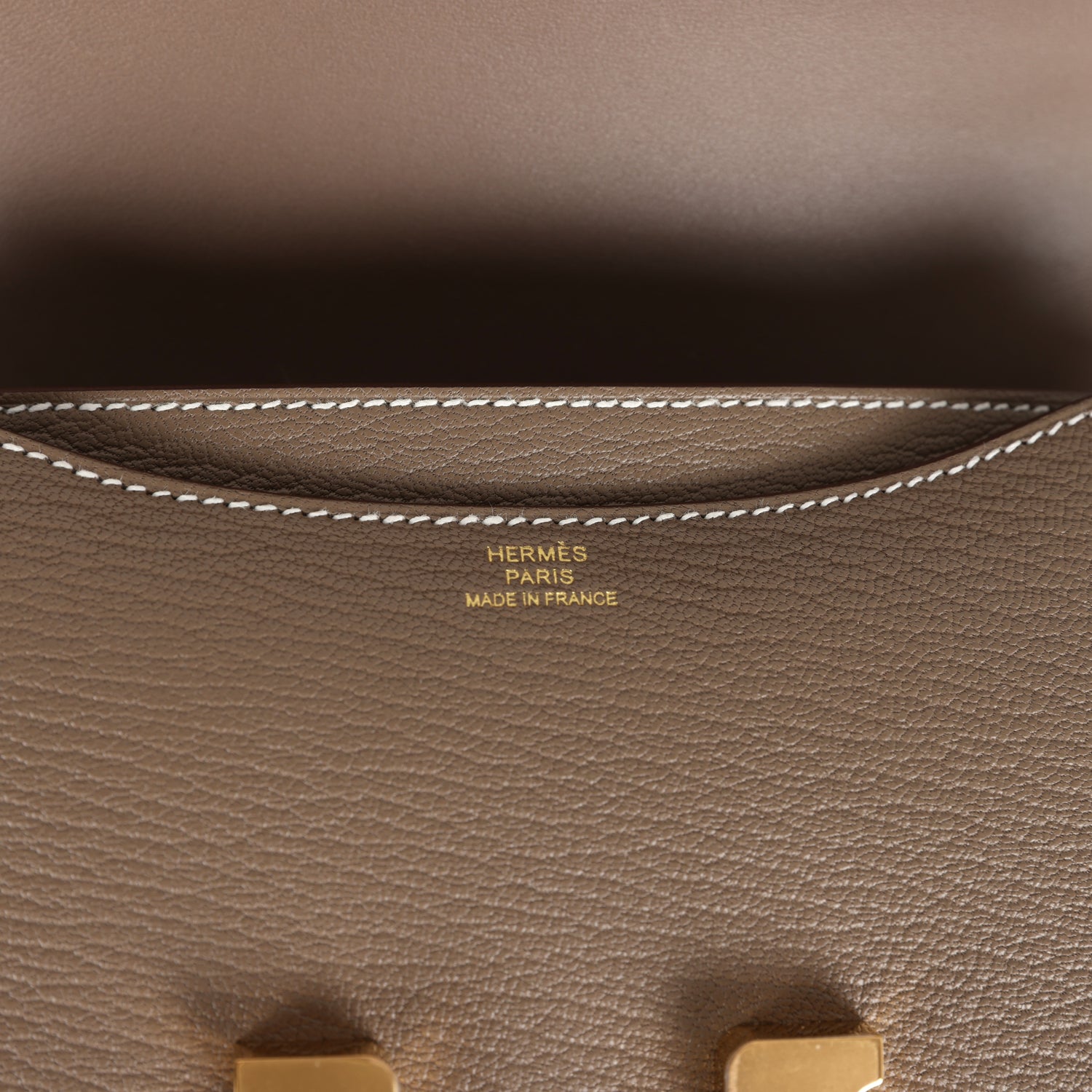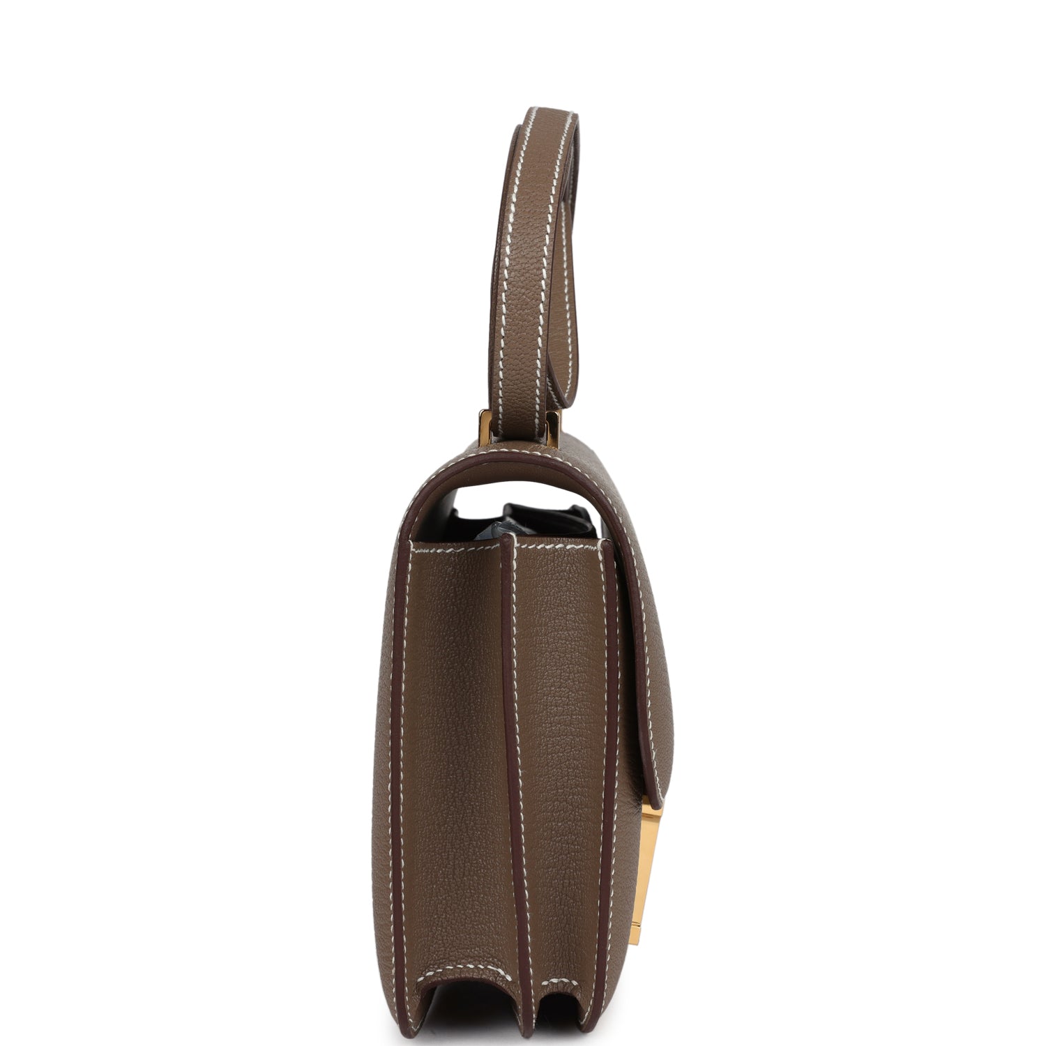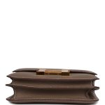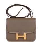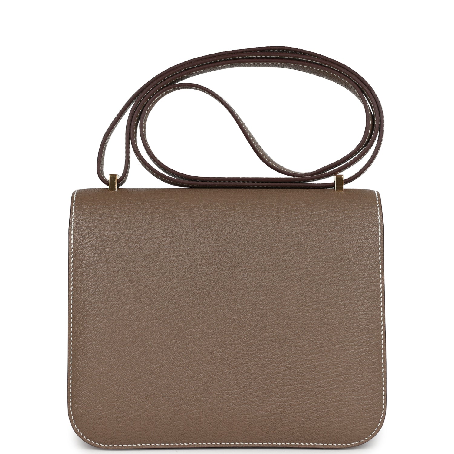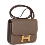 This Constance 1-18 is in Etoupe Chevre Mysore leather with gold hardware, contrast stitching, a metal “H” snap lock closure and adjustable shoulder strap.
