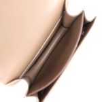 The interior is lined with Etoupe lambskin and has two open pocket on the front wall, a removable mirror, a center divide, and a slit pocket on the back wall.