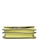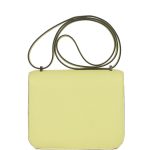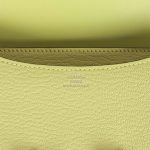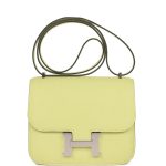This Constance is inJaune Bourgeonchevre leatherwith palladium hardware and has tonal stitching, ametal “H” snap lock closure and adjustable shoulder strap.