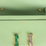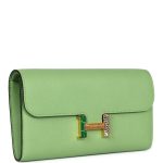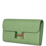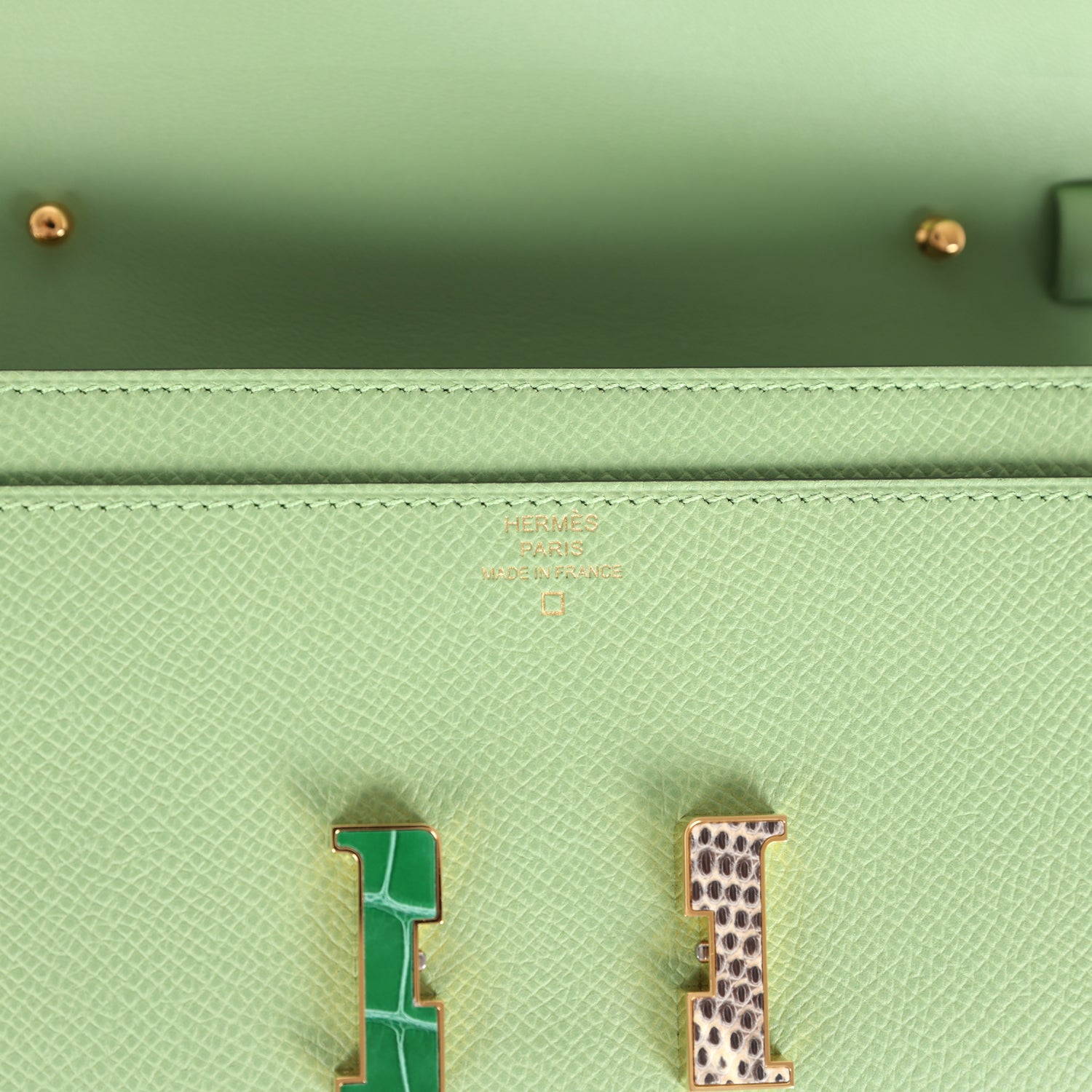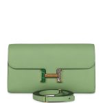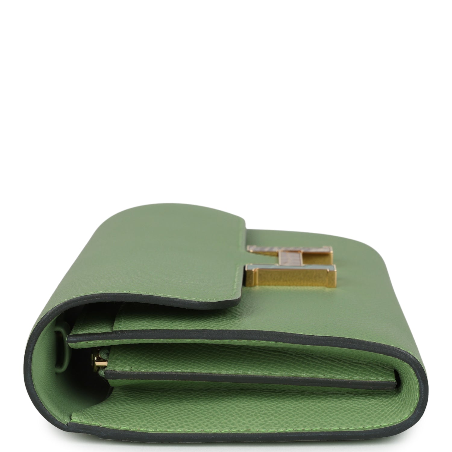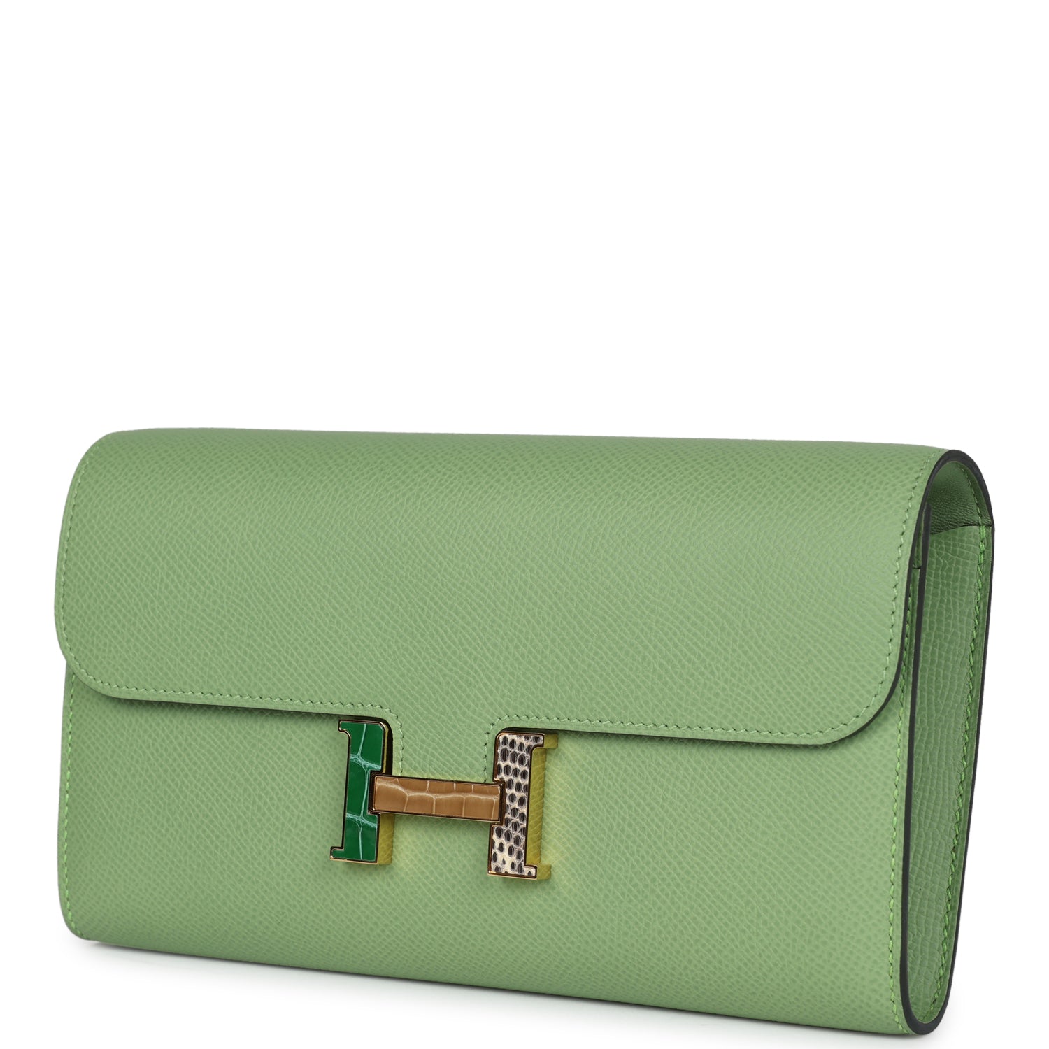 This Constance Wallet To Go Marquette is in Vert Criquet epsom leather with gold and Ombre Lizard, Beige Sable and Cactus Alligator hardware and has tonal stitching, metal “H” snap lock closure, open front compartment and removable crossbody strap.