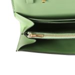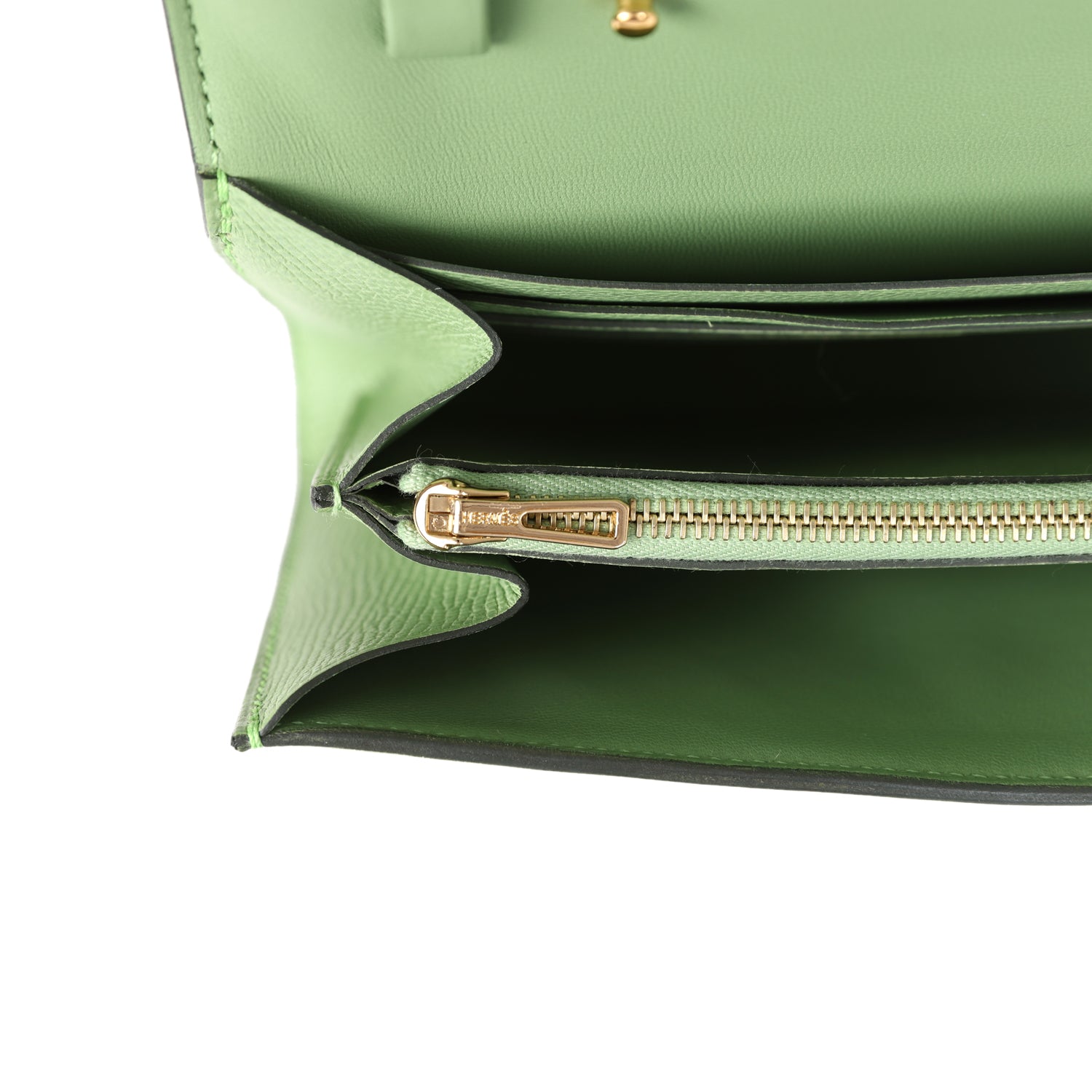 The interior is lined with Vert Criquet leather and two main compartments with six credit card slots and a zippered center compartment with Hermès H lock pull.