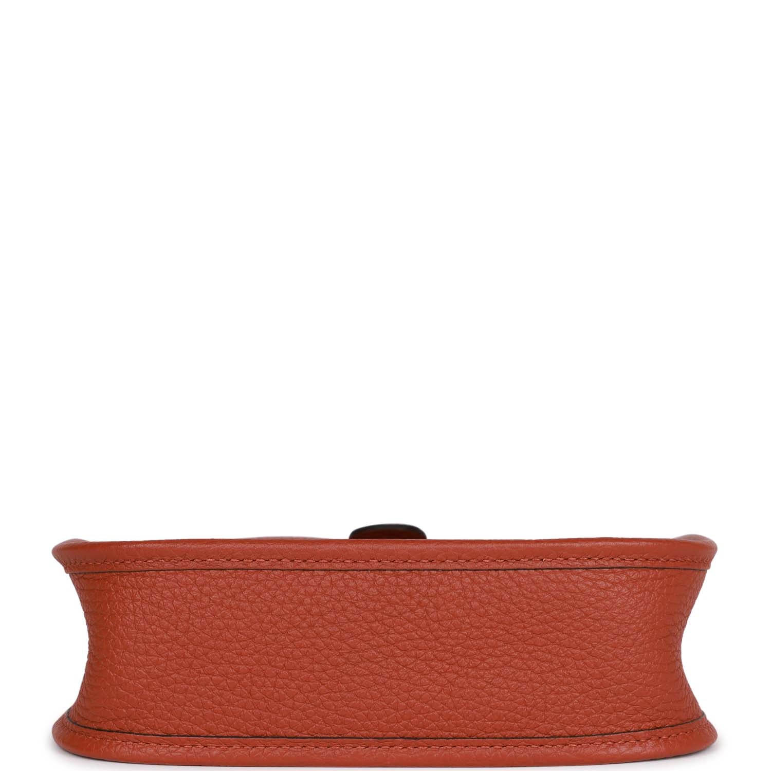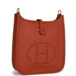 This Evelyne isCuivre Taurillon Clemence leather Evelyne with tonal stitching, palladium hardware, large perforated H in circle (front), pull tab snap closure, anddetachable Capucine/Parme/Rouge shoulder/crossbody strap.