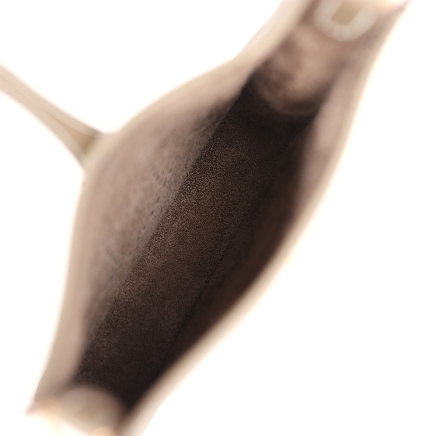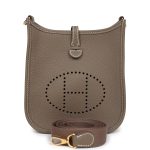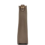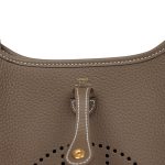 This Evelyne TPM isin Etoupe clemence leather with gold hardware and has contrast stitching, pull tab top closure and a removable canvas and leather shoulder/crossbody strap.