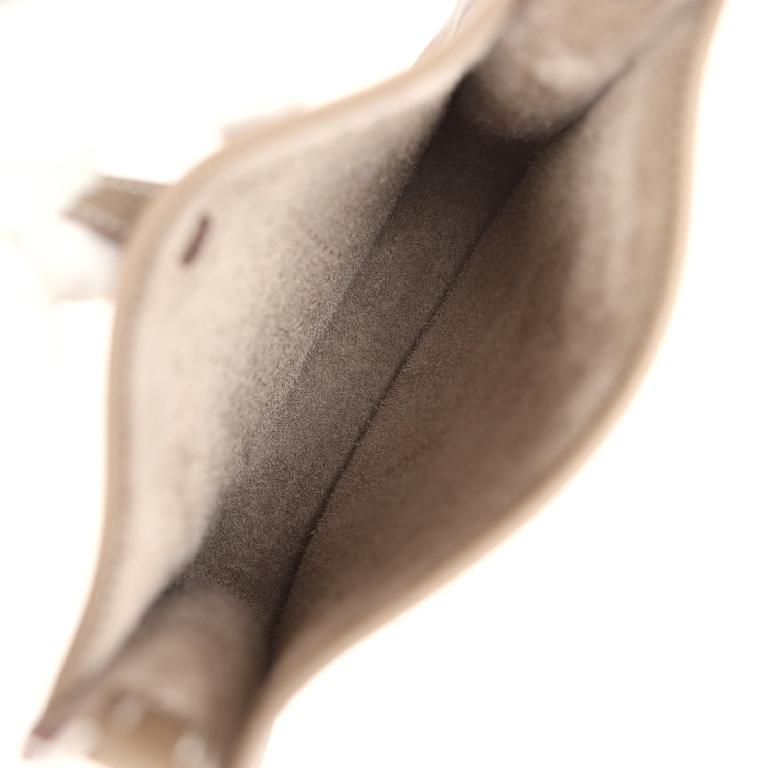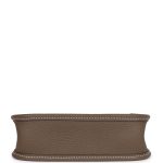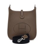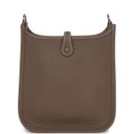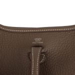 This Evelyne TPM isin Etoupe clemence leather with palladium hardware and has contrast stitching, pull tab top closure and a Bleu Indigo removable canvas and leather shoulder/crossbody strap.