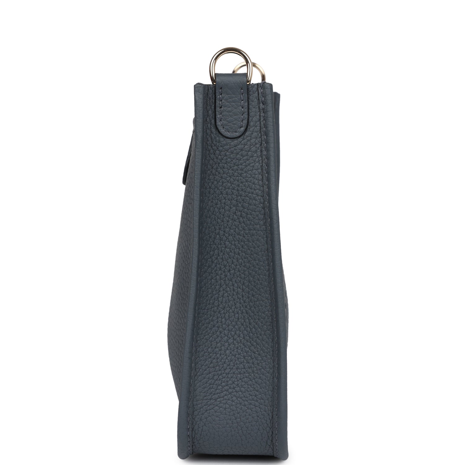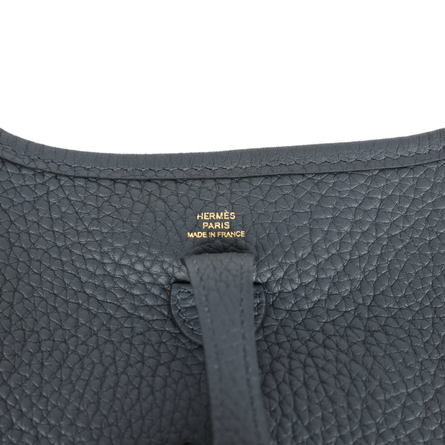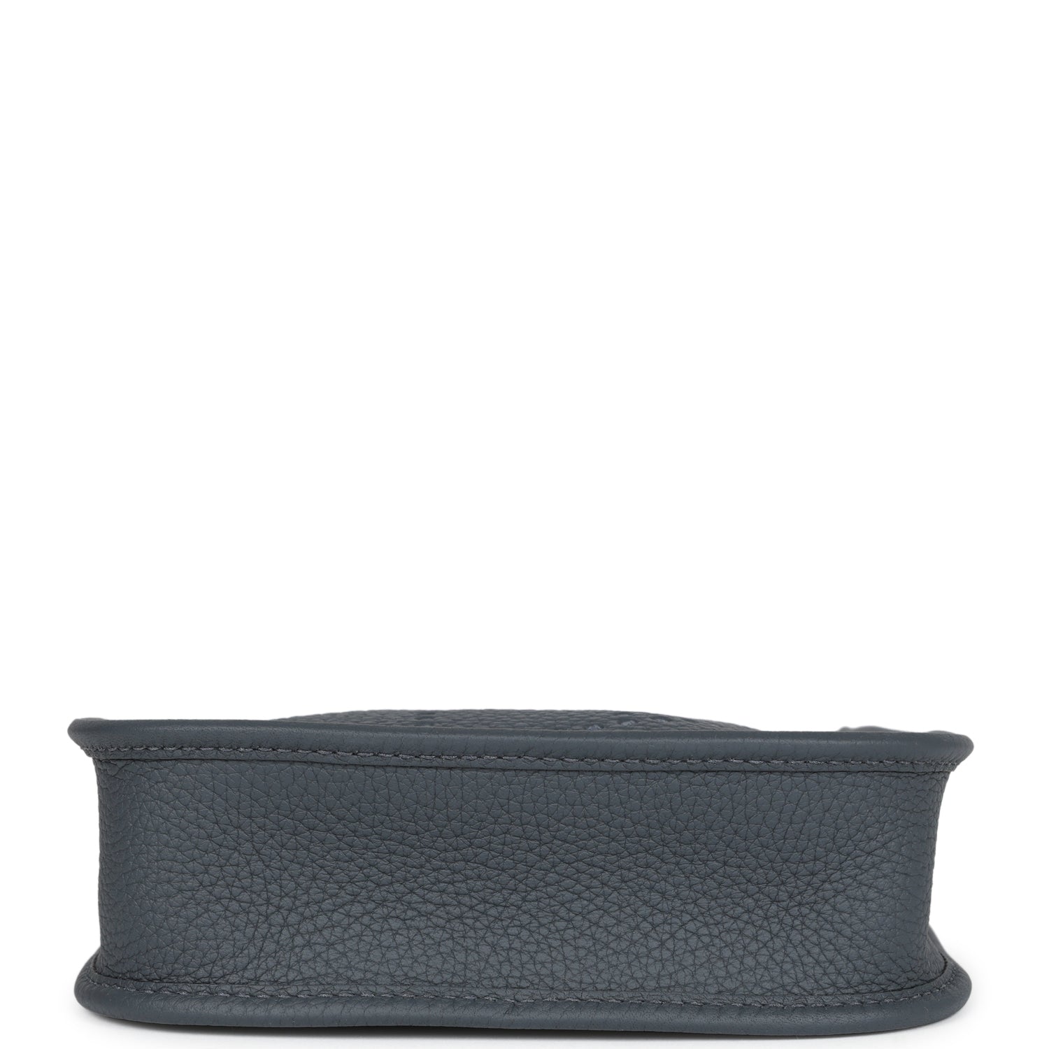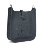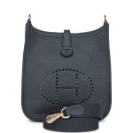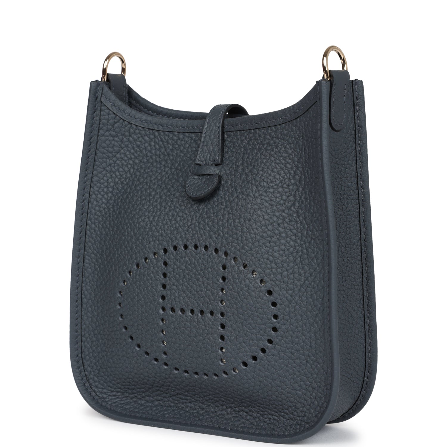 This Evelyne TPM is in Gris Misty clemence leather with permabrass hardware,leather messenger bag with tonal stitching, large perforated H in circle (front), pull tab snap closure, and a removable shoulder/crossbody strap.