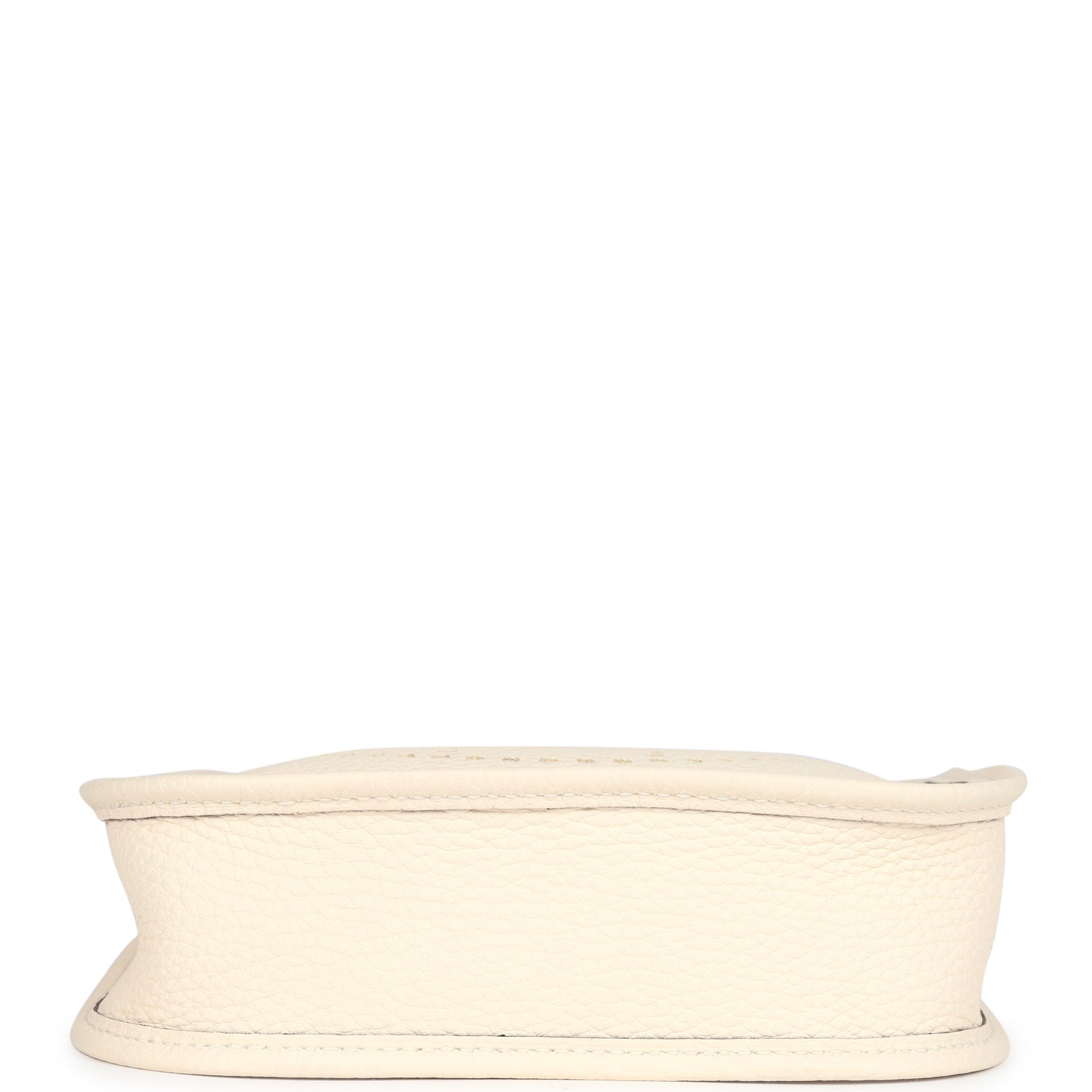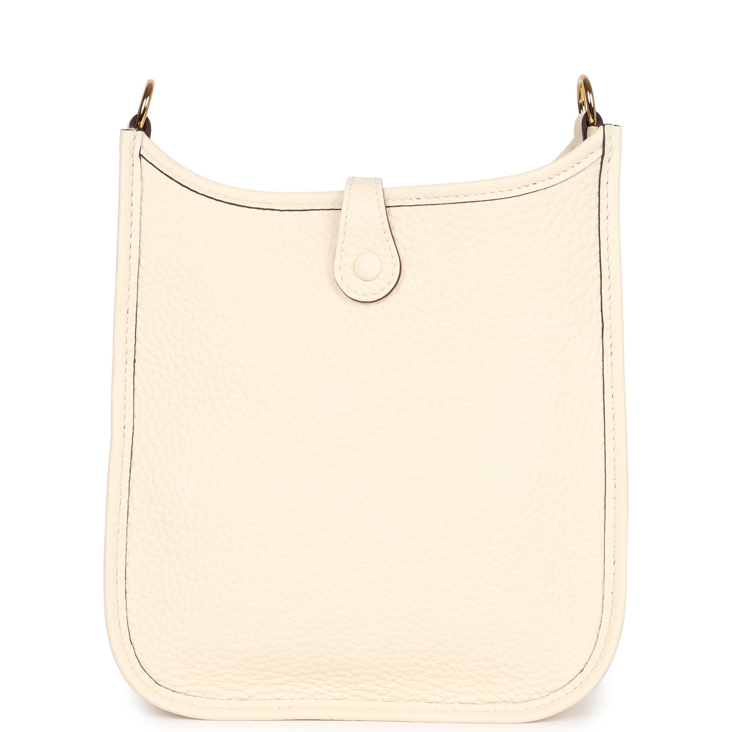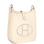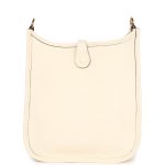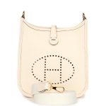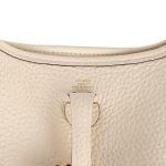 This Evelyne TPM is in Nata clemence leather with gold hardware and features tonal stitching, large perforated H in circle (front), pull tab top closure and a matching removable canvas and leather shoulder/crossbody strap.