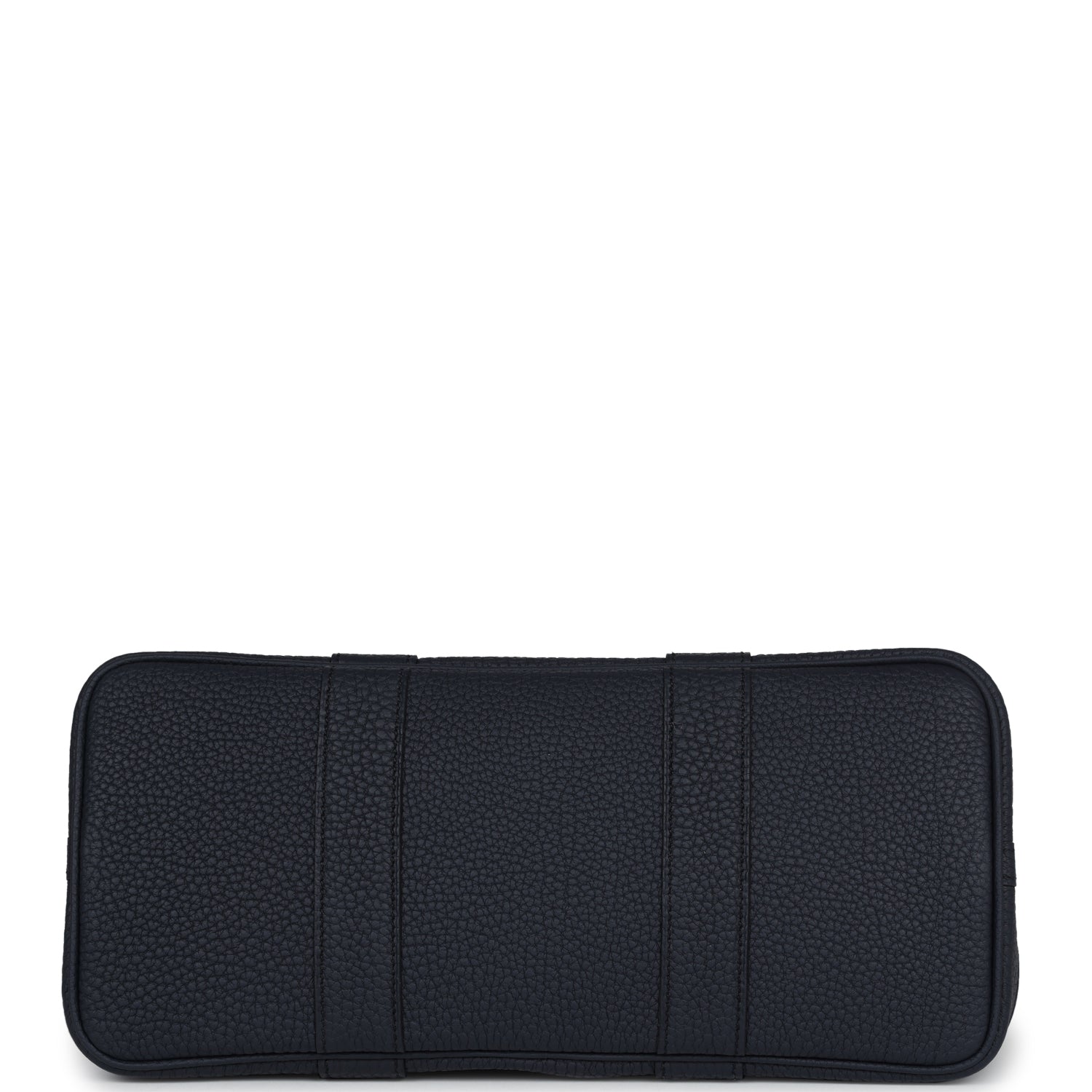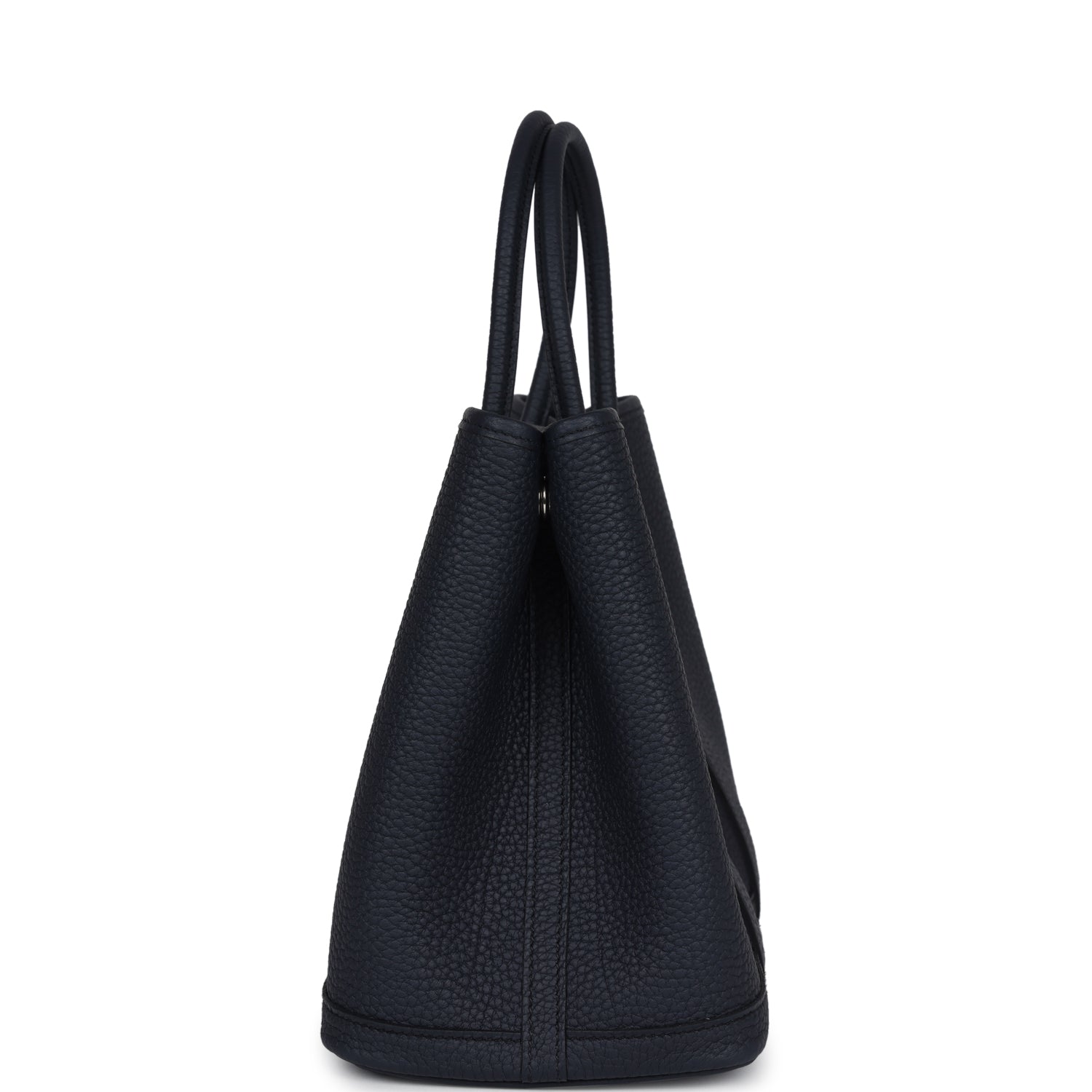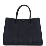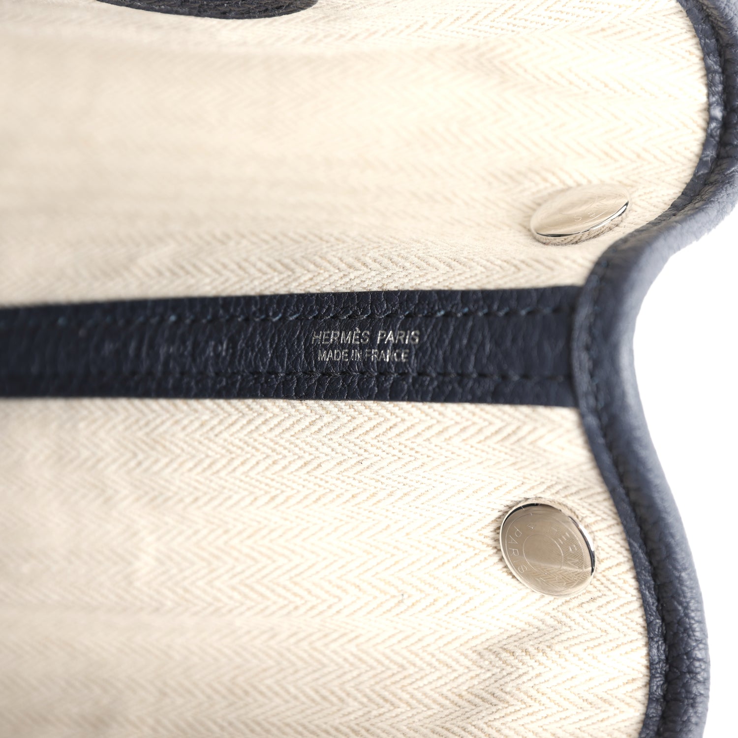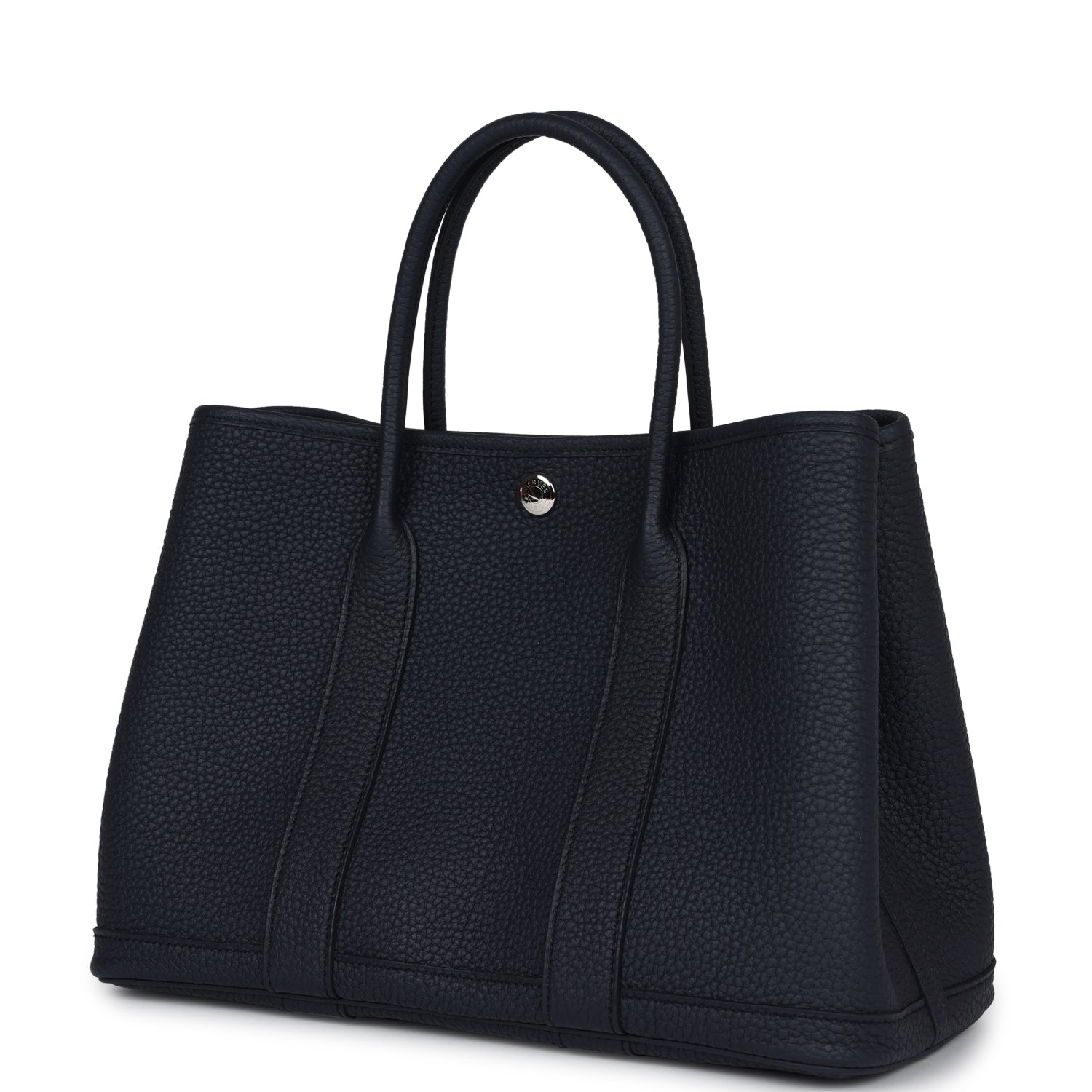 This Garden Party is of Bleu Nuit negonda leather with palladium hardware, tonal stitching, one engraved palladium front snap closure with two snap closures on side to adjust bag width. This bag features two top handles and flat interior zipper pocket with engraved zipper pull.