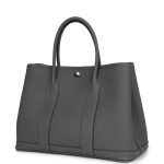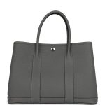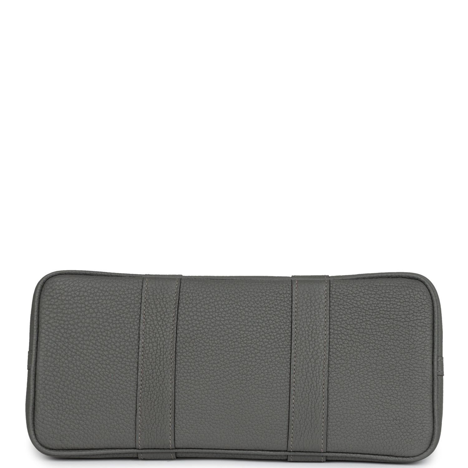 This Garden Party is in Gris Meyer Negonda with palladium plated hardware, features tonal stitching, Clou de Selle snap closure, and double rolled handles.