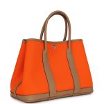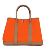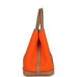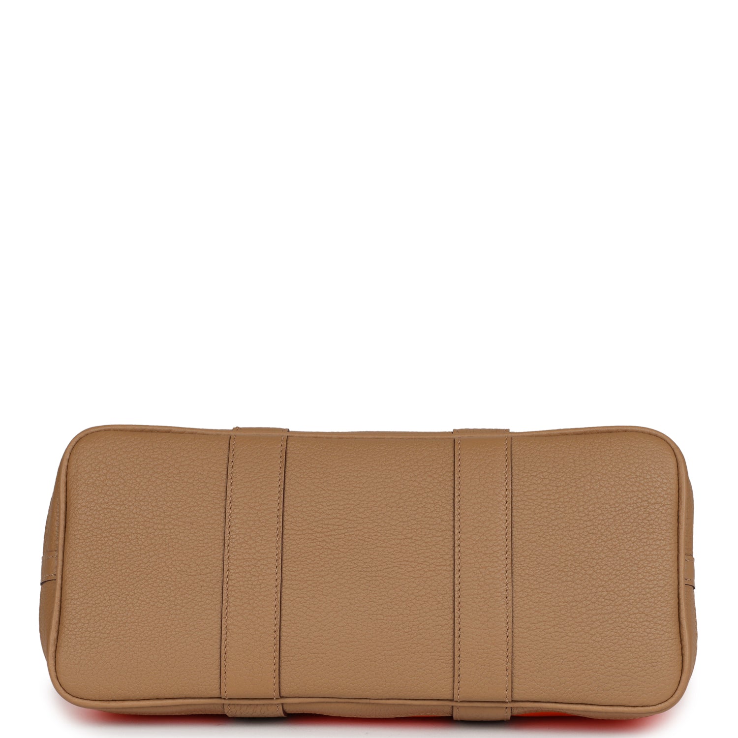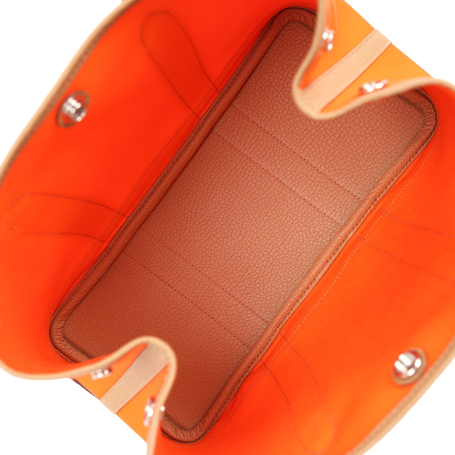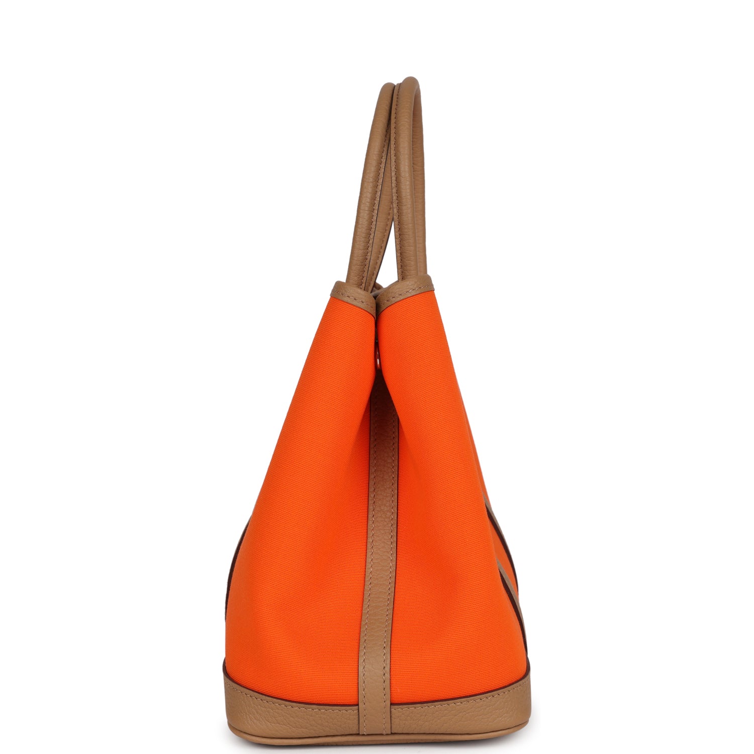 This Hermès Garden Party 30 is in Orange Minium toile canvas and Biscuit Negonda leather with palladium hardware, and features tonal stitching, toile canvas lining, one engraved palladium front snap closure with two snap closures on side to adjust bag width. This bag features two leather top handles.