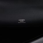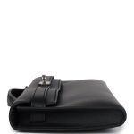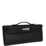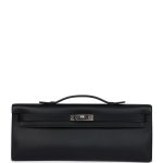 This Hermès Kelly Cut is in Black swift leather with palladium hardware, features tonal stitching, front flap, pull straps that attach to a toggle, and small top handle.