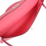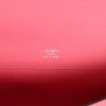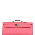 This Kelly Cut wallet is in Rose Azalee swift leather with palladiumhardware, features tonal stitching, front flap, pull straps that attach to a toggle, and small top handle.