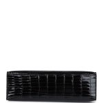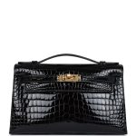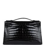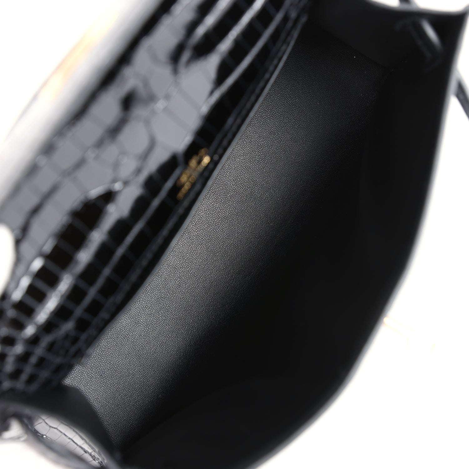 This Kelly Pochette is in Black shiny Porosus Crocodile with gold hardware and has tonal stitching, front flap with two straps, toggle closure and single flat handle.